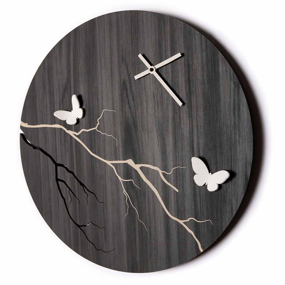 Ceas de perete rotund din lemn cu decorațiuni gravate cu laser și fluturi tridimensionali, fabricat în Italia.