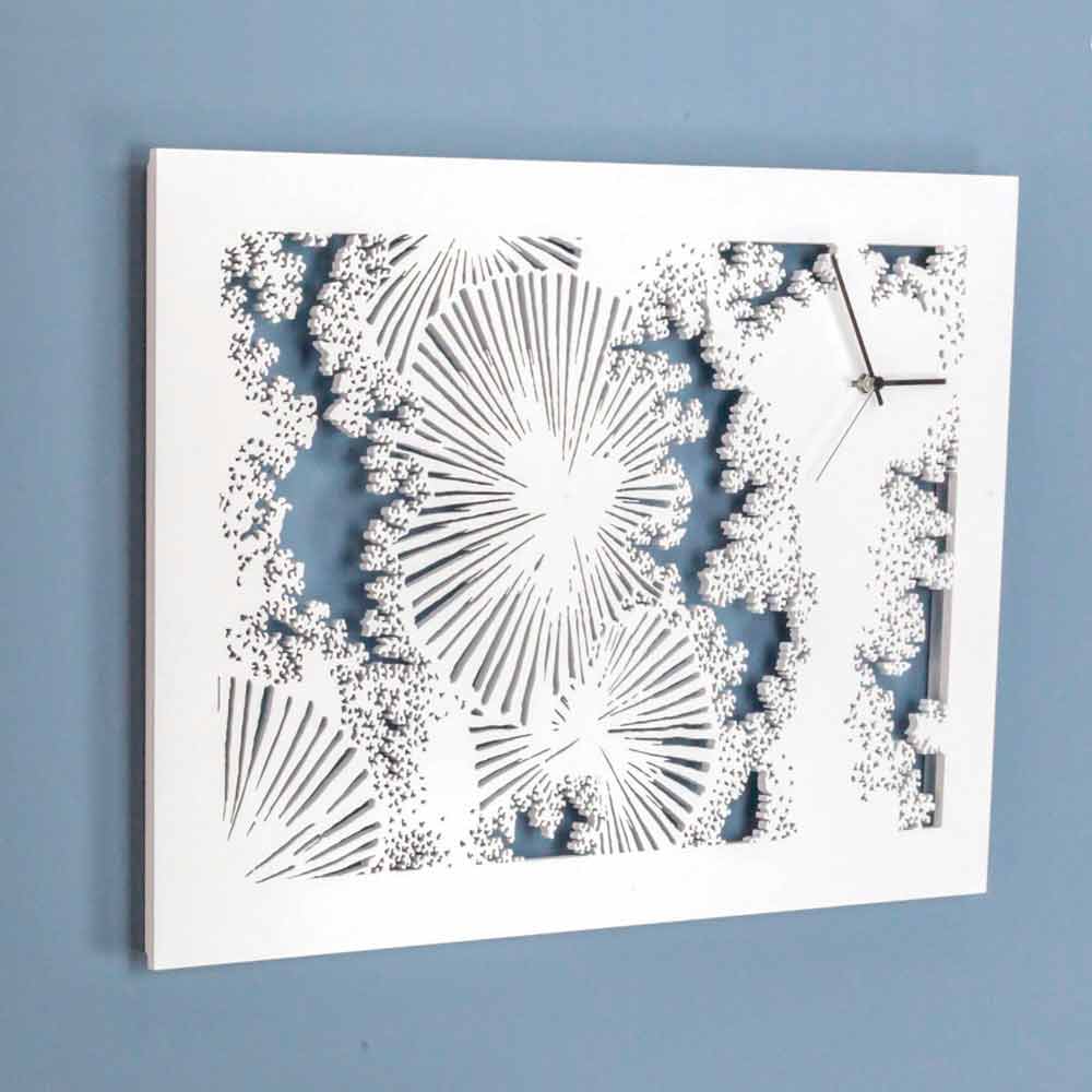 Ceas de perete mare din lemn alb sau gri porumbel, design dreptunghiular și modern, sculpturi laser realizate în Italia.