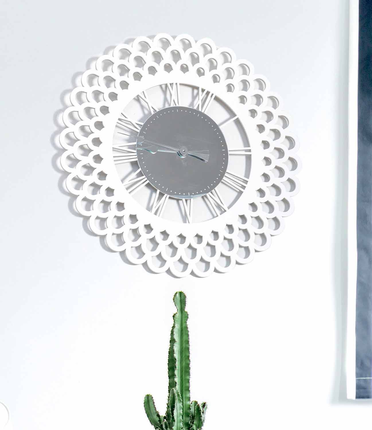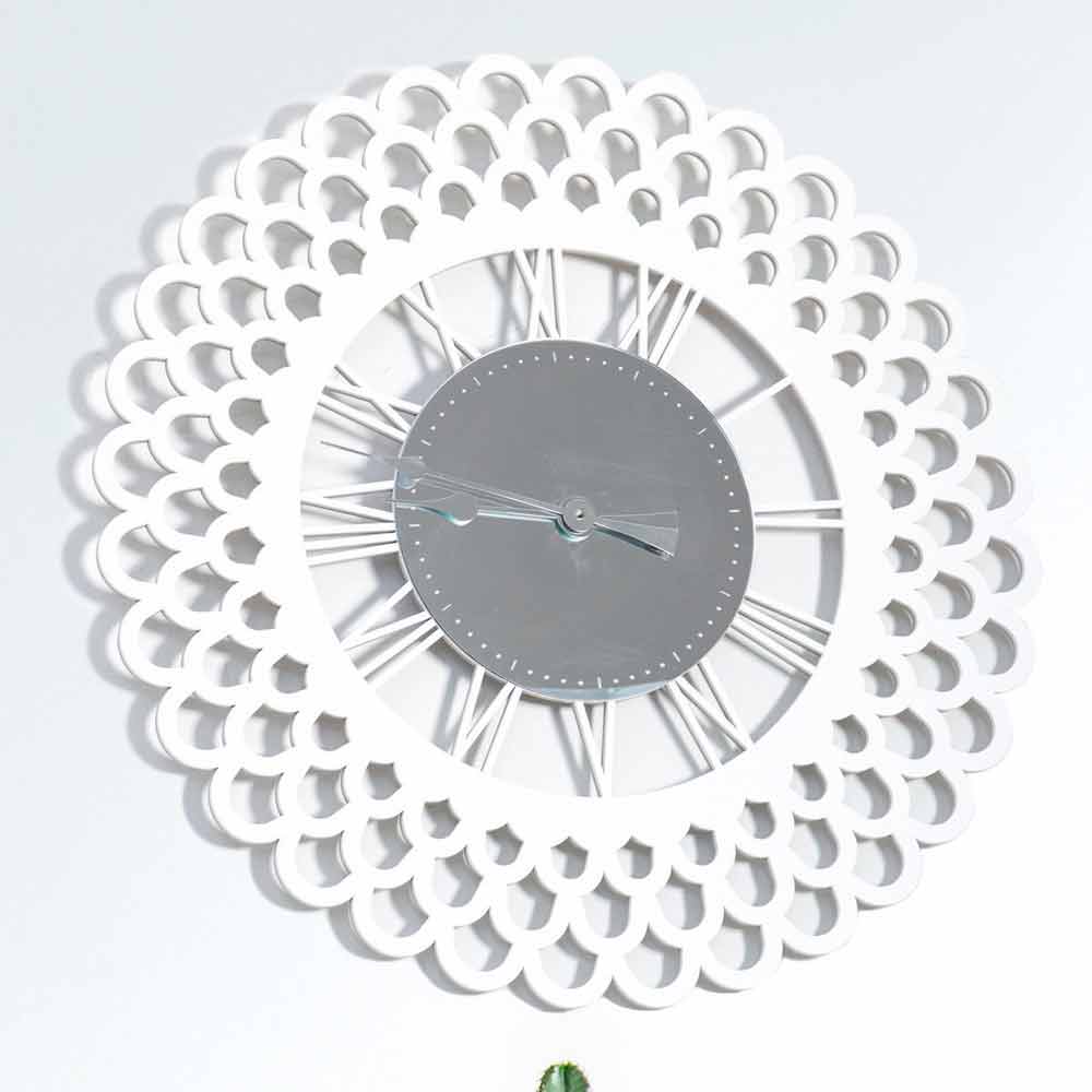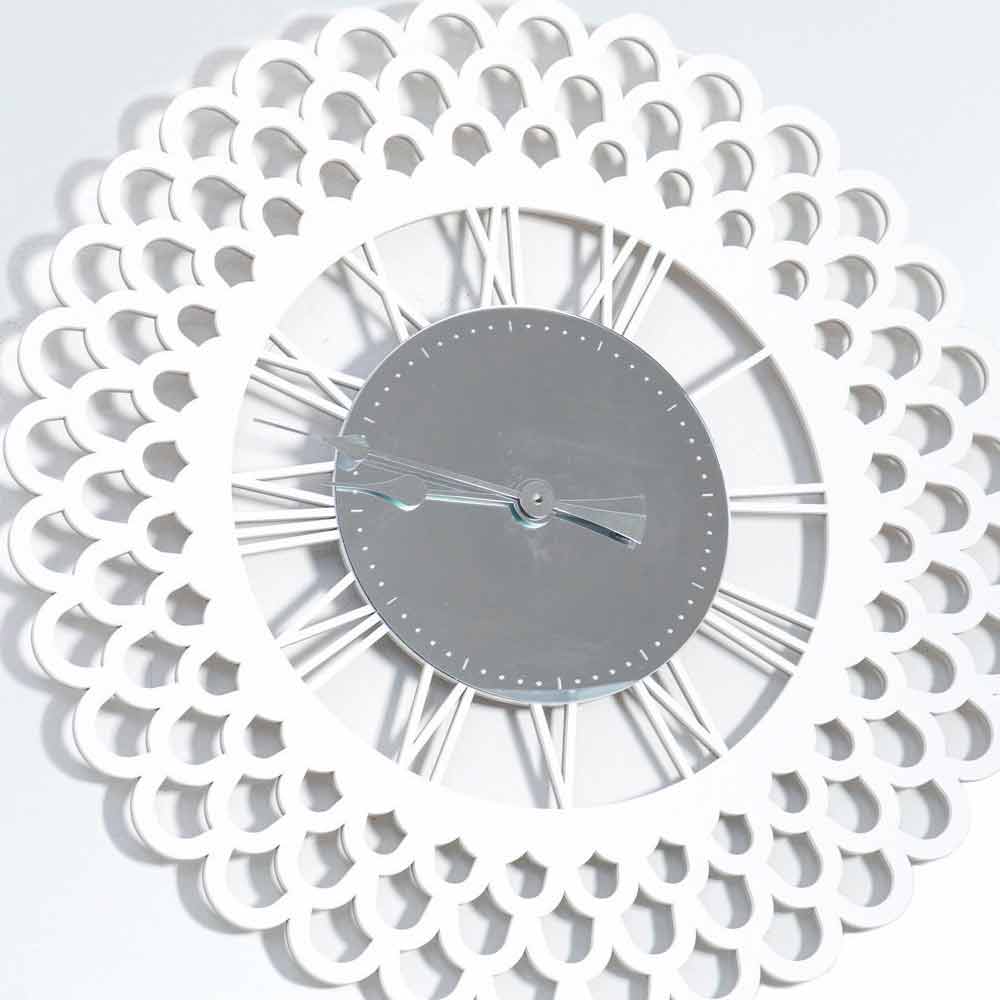 Ceas de perete mare, design modern din lemn alb, cu decor în oglindă, formă florală făcută în Italia.