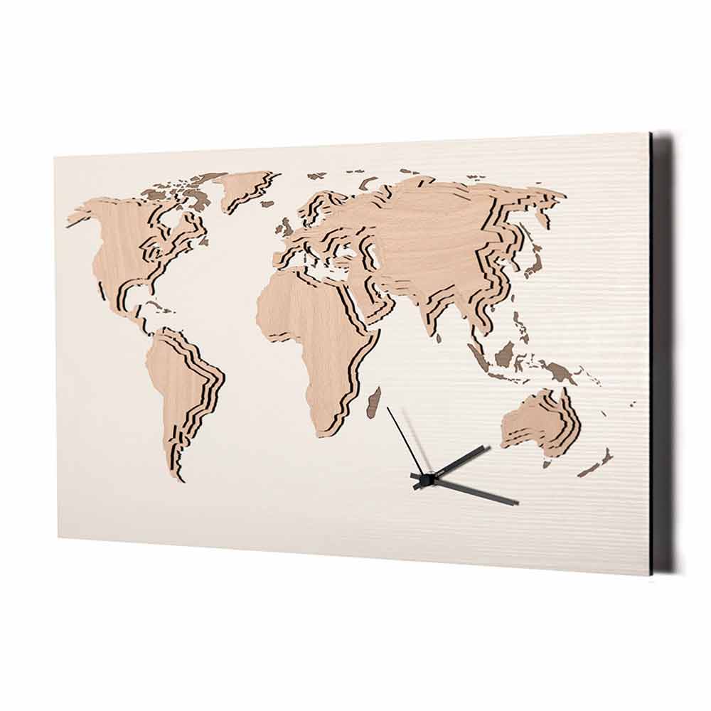 Ceas de perete dreptunghiular din lemn cu hartă mondială decorativă, fabricat în Italia.