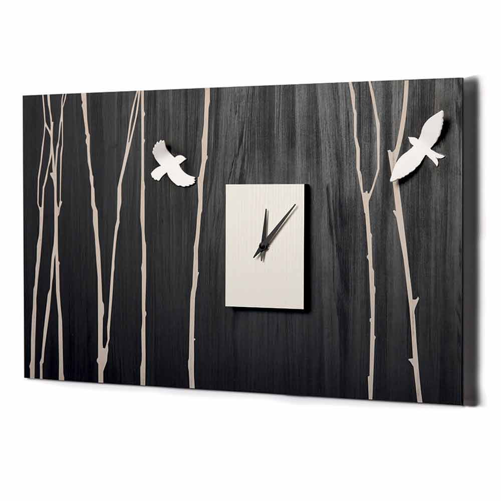 Acest ceas de perete este realizat din lemn de culoare tablă cu reprezentarea ramurilor de iarnă marcate cu laser și decorațiuni tridimensionale, cum ar fi casa de păsări din lemn și păsările în metacrilat opac.