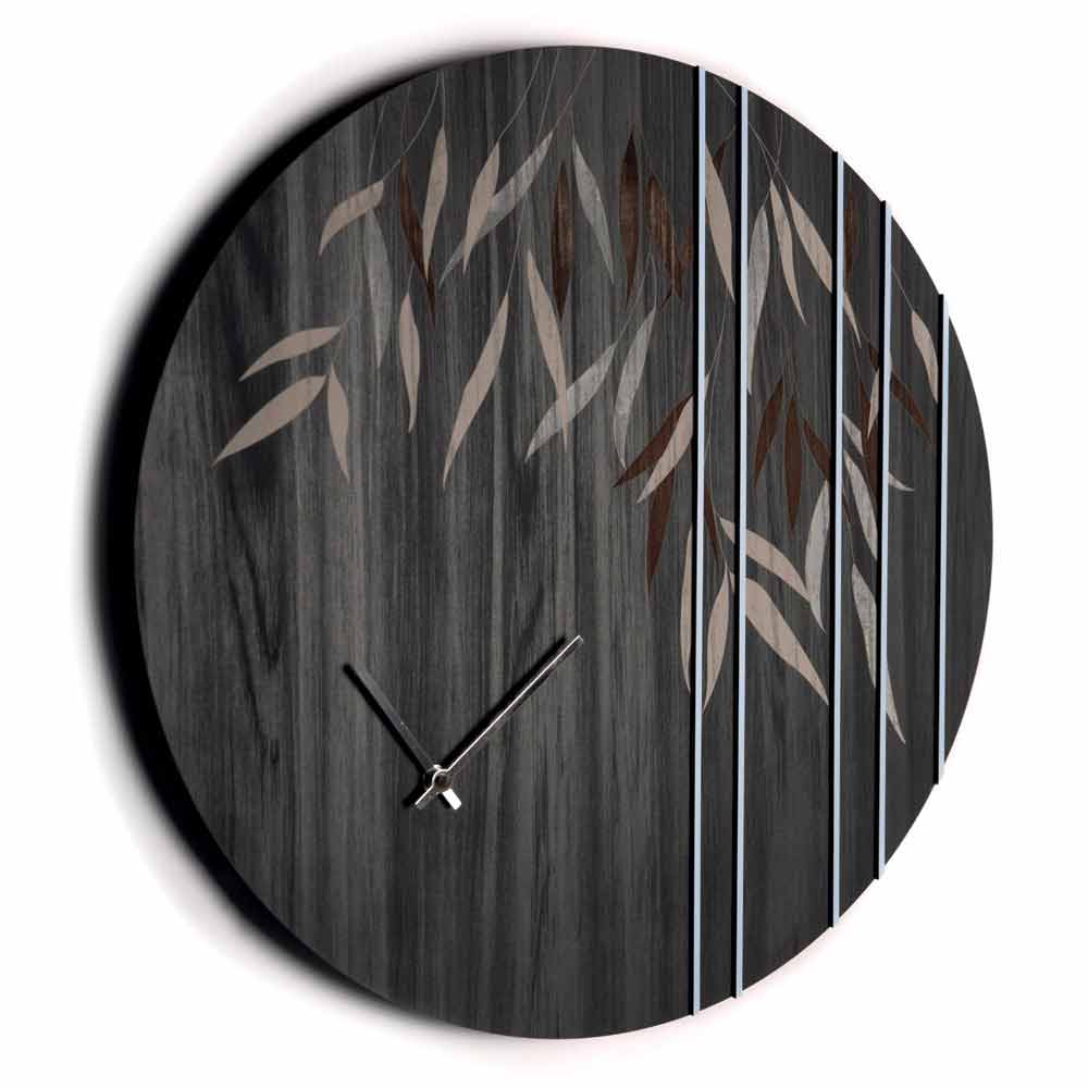 Ceas de perete rotund din lemn cu gravură laser și decorațiuni din lemn lăcuit, realizat în Italia.