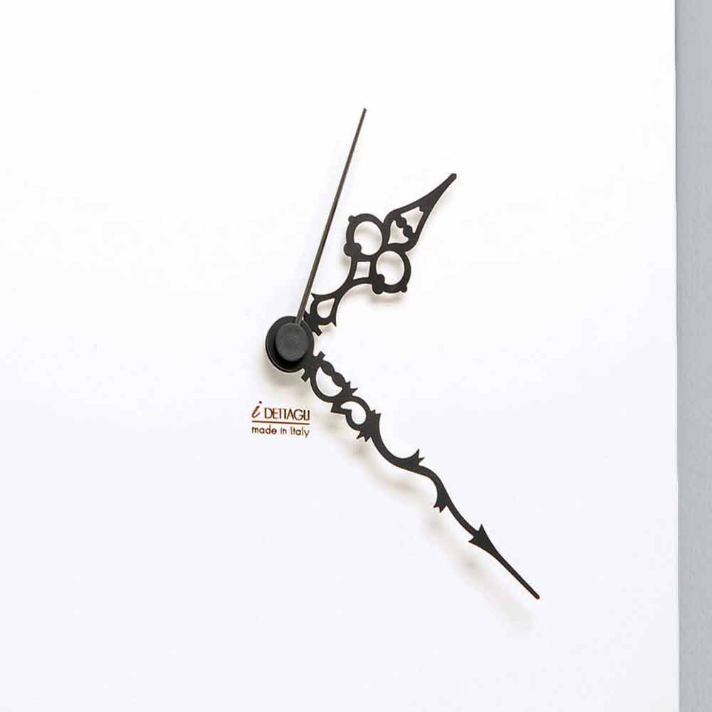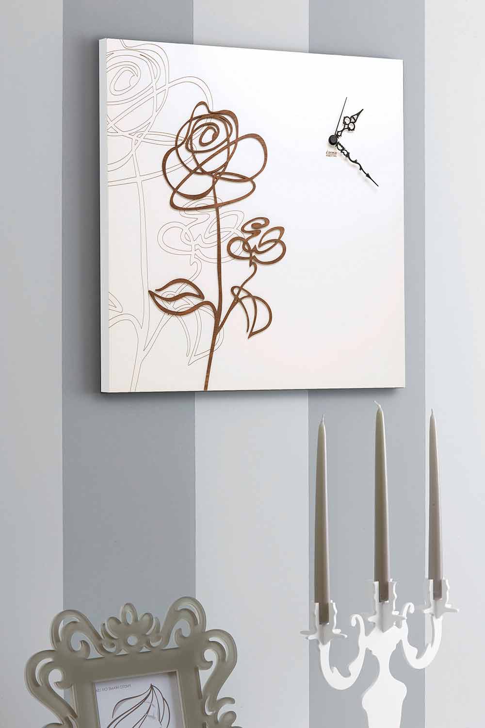 Ceas de perete pătrat din lemn alb cu decor floral în lemn întunecat, design modern realizat în Italia.