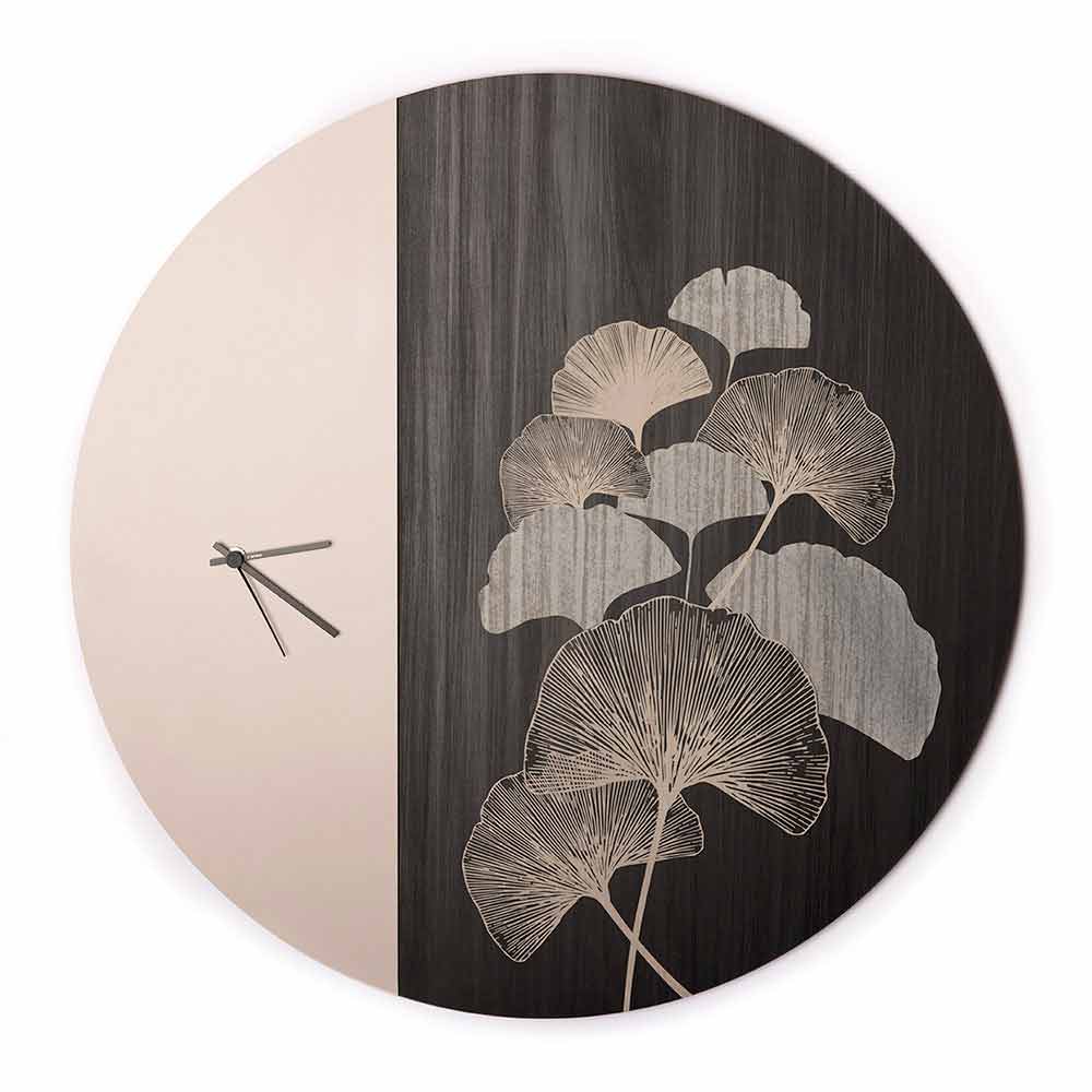 Ceas de perete din lemn cu decor marcat cu laser, design rotund în două finisaje fabricat în Italia.