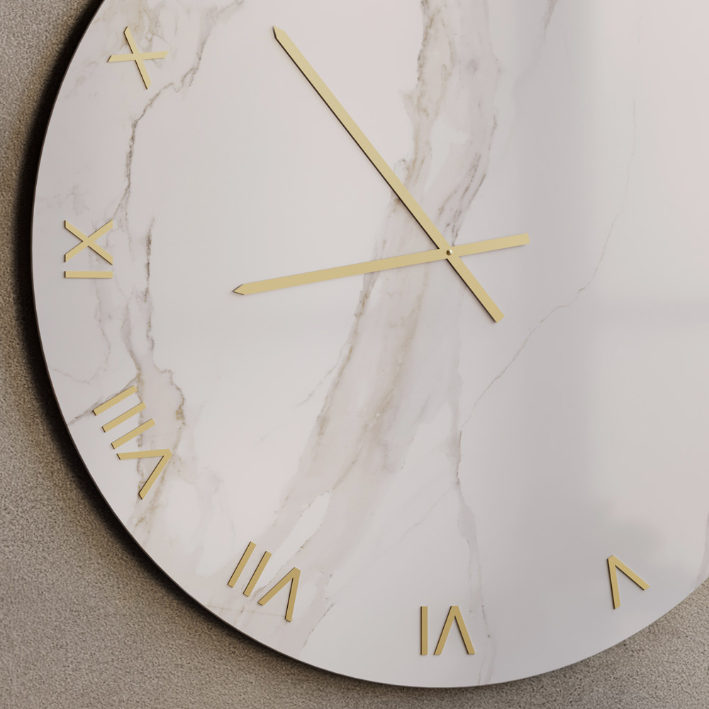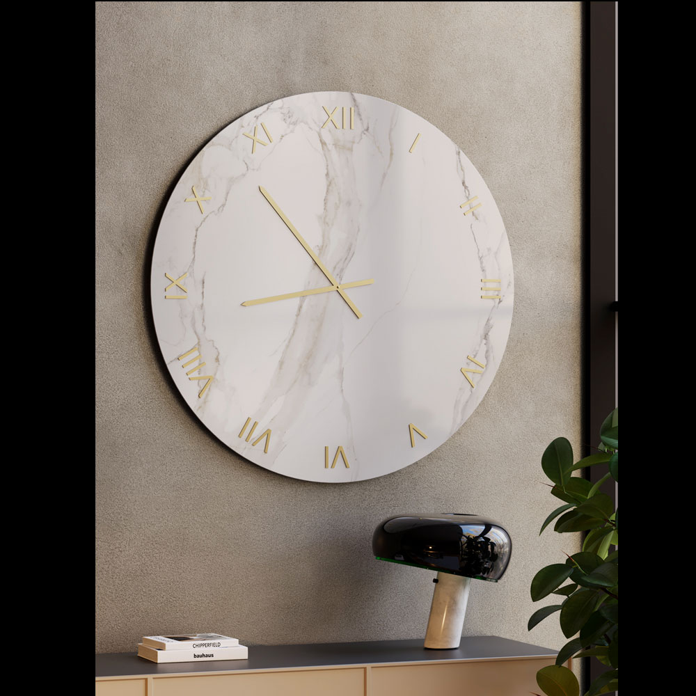 Ceasul de perete din sticlă, cu finisaj serigrafiat cu efect de marmură Calacatta, este o piesă de mobilier rafinată, concepută pentru a îmbunătăți spațiile moderne și contemporane cu o notă de lux atemporal. Suprafața de sticlă evidențiază nervurile delicate inspirate de marmura naturală, creând un joc elegant de lumină și profunzime.