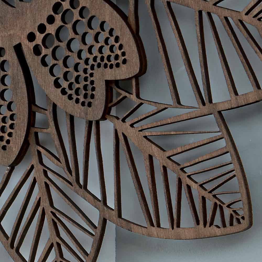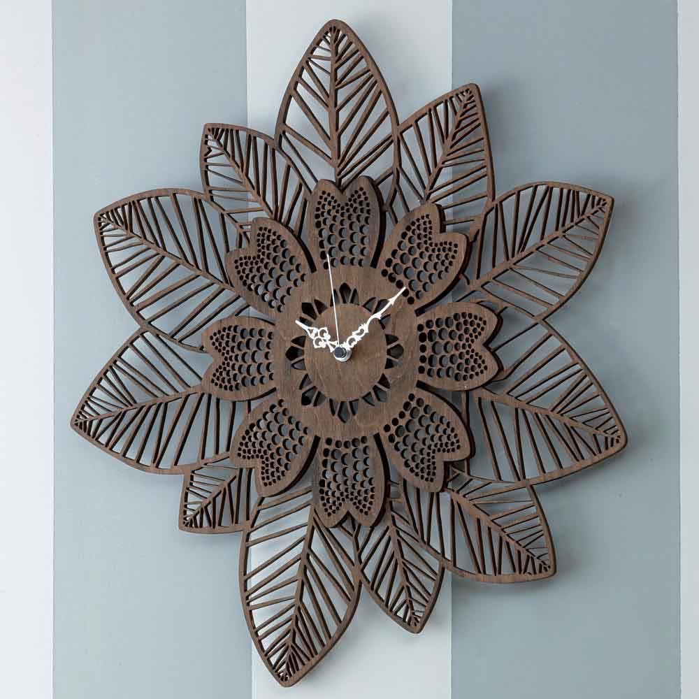 Ceas de perete modern, design în lemn deschis sau wengè, formă florală făcută în Italia.