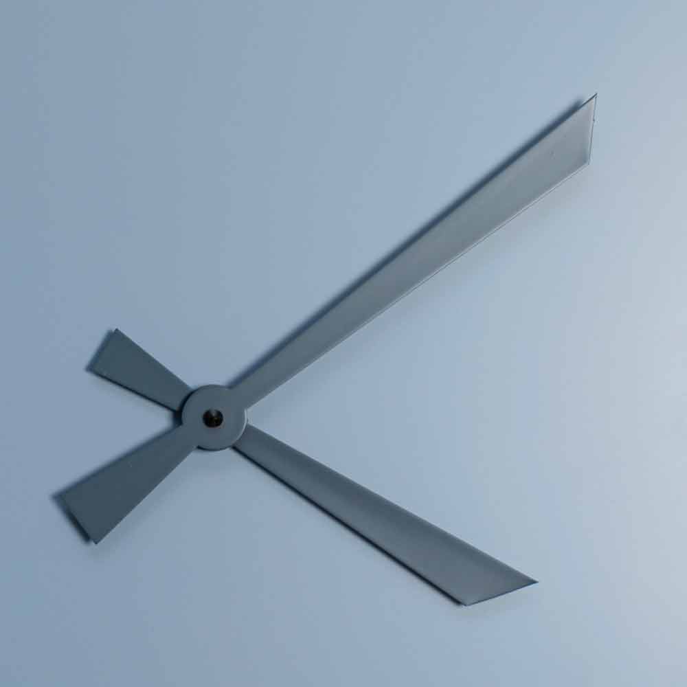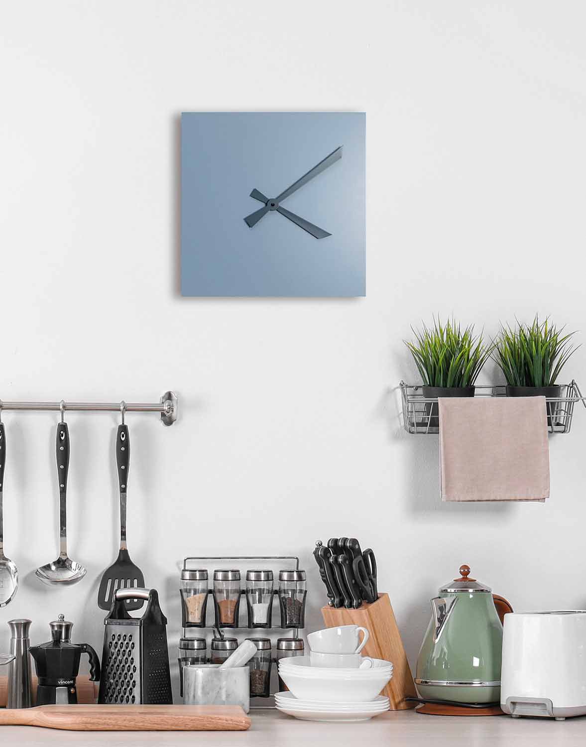 Ceas de perete pătrat și albastru, design modern din lemn, realizat în Italia.