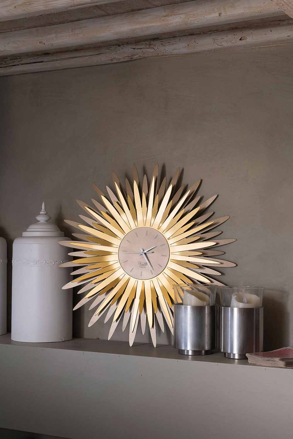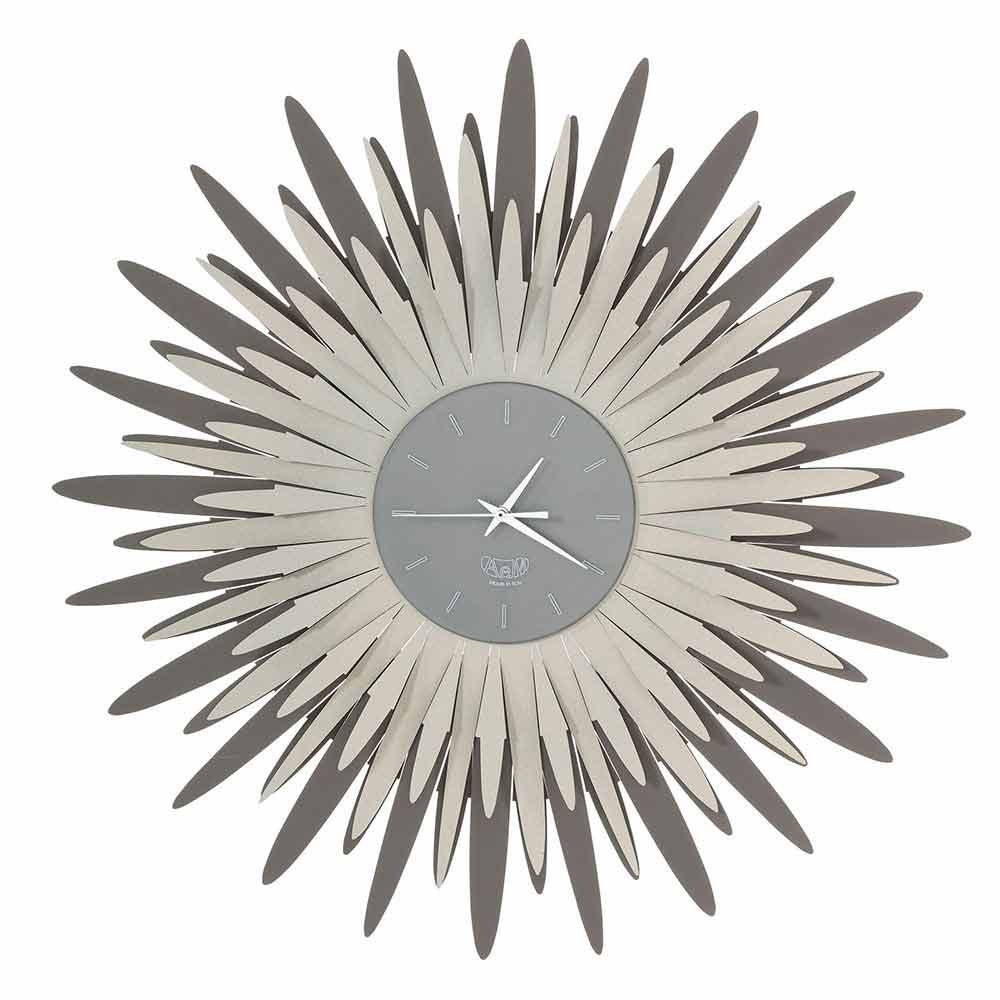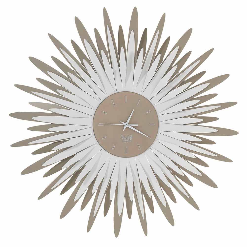 ceas de perete armonios caracterizat prin raze de soare numeroase și luminoase în jurul cadranului.