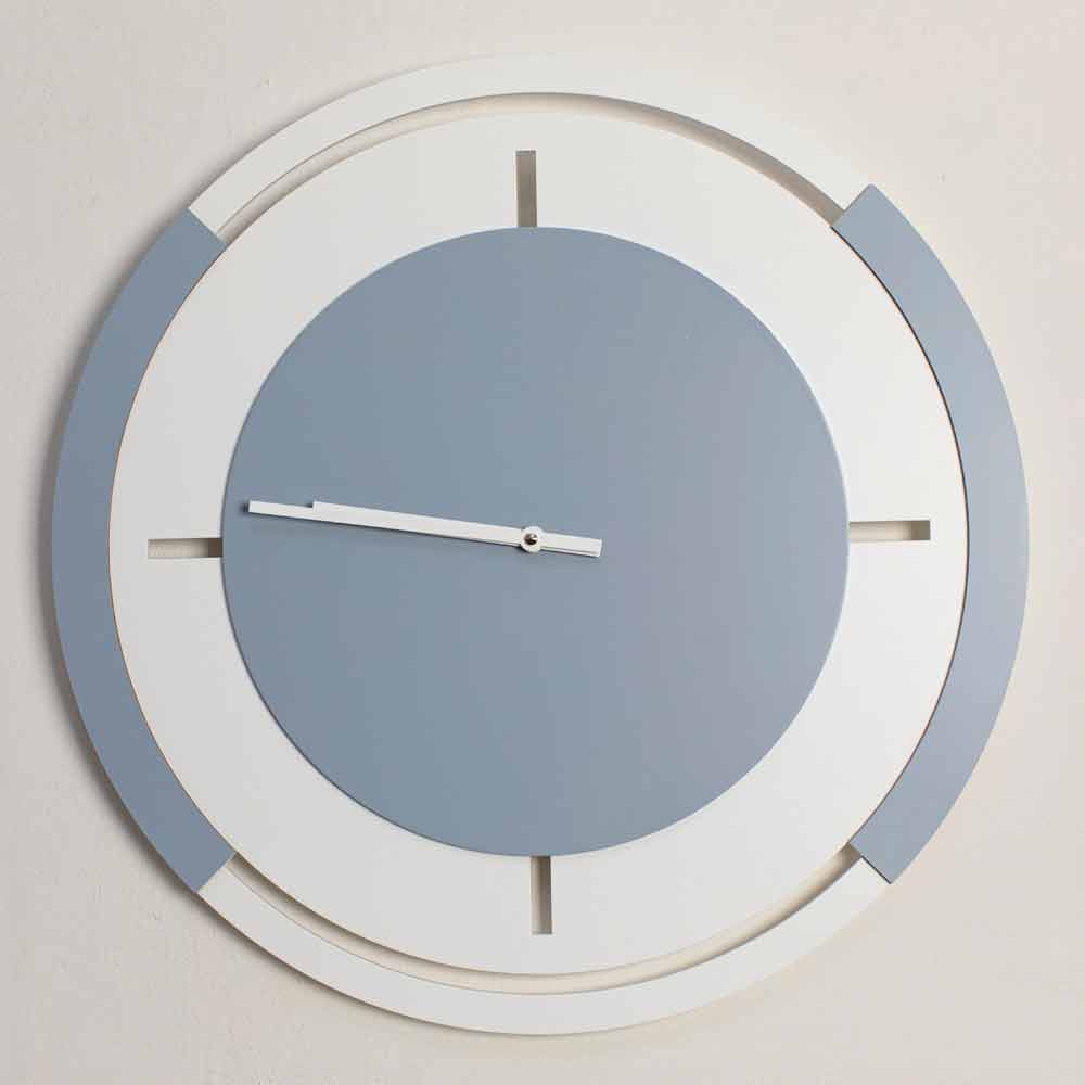 Ceas de perete rotund din lemn lacat alb și avio, design modern realizat în Italia.