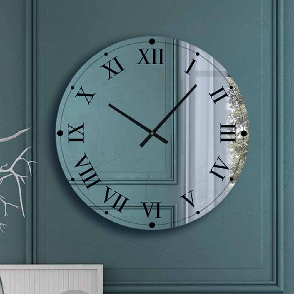 sticla de cristal cu oglinda cu cifre romane si maini negre.