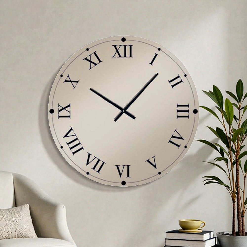 Ceas de perete rotund , fabricat în Italia , din cristaloglindit , cu cifre romane și ace negre. Utilizarea unui finisaj oglindit face ca această piesă de mobilier să fie fuziunea perfectă între o oglindă și un ceas adevărat, îndeplinind o funcție extrem de utilă, acționând totodată ca o sursă de lumină minunată, contribuind la mărirea optică a spațiilor. Designul său este caracterizat de eleganță și esențialitate , caracteristici care dau naștere unui articol elegant, ideal pentru cele mai variate medii moderne, oferind o notă personală și creativă mobilierului și sporindu-i valoarea estetică.