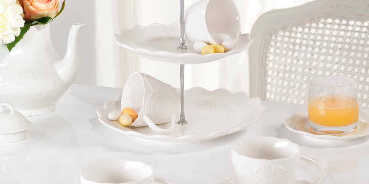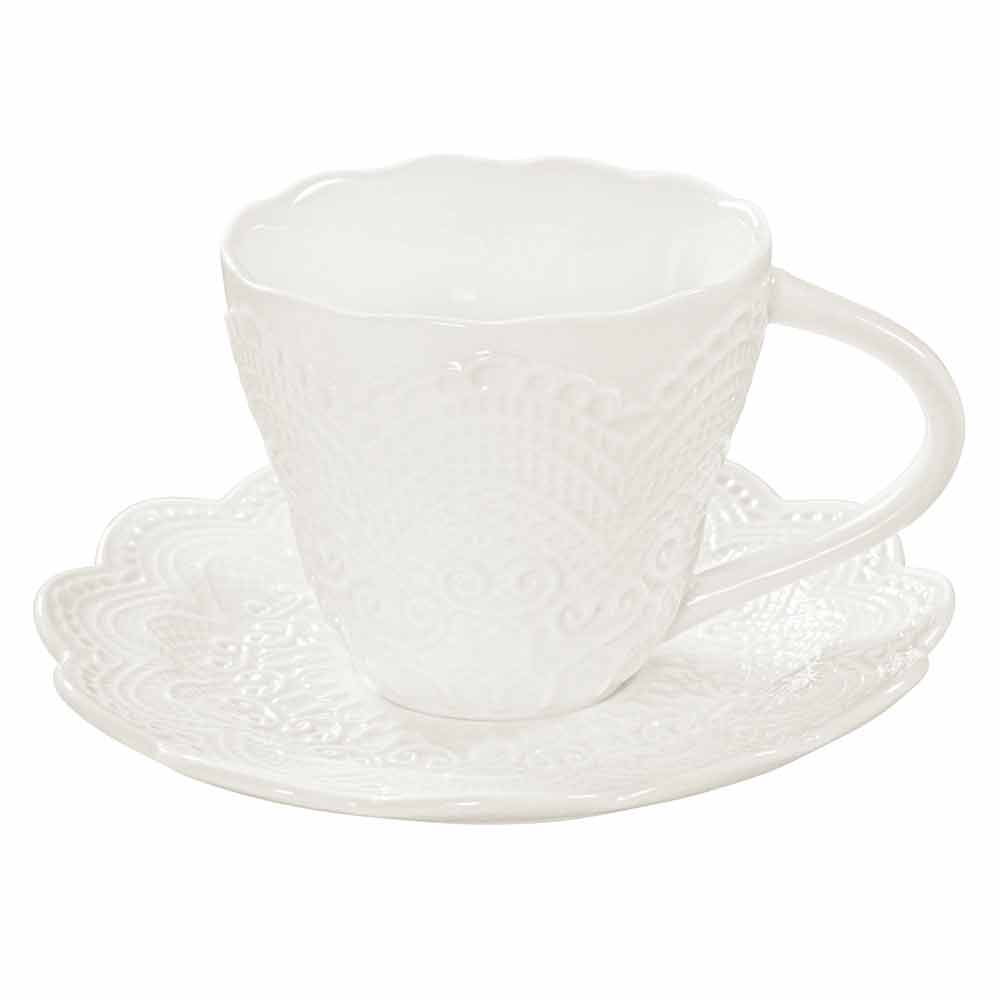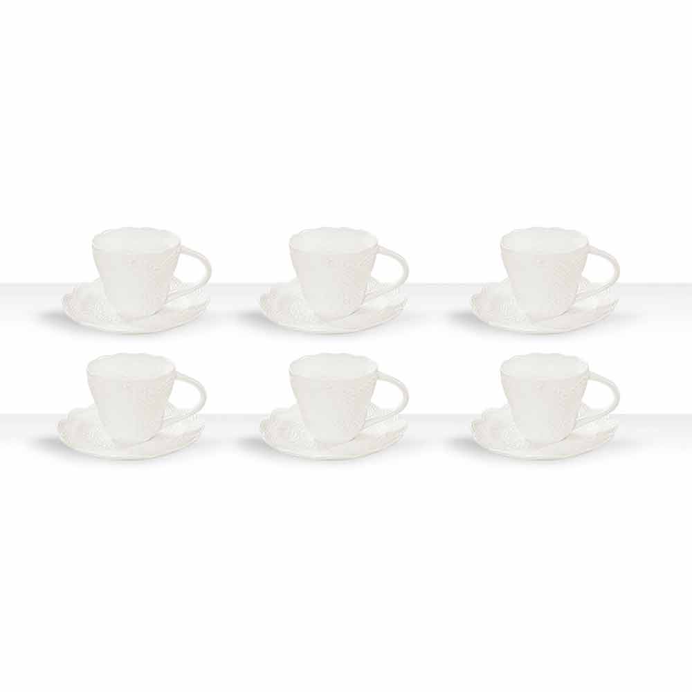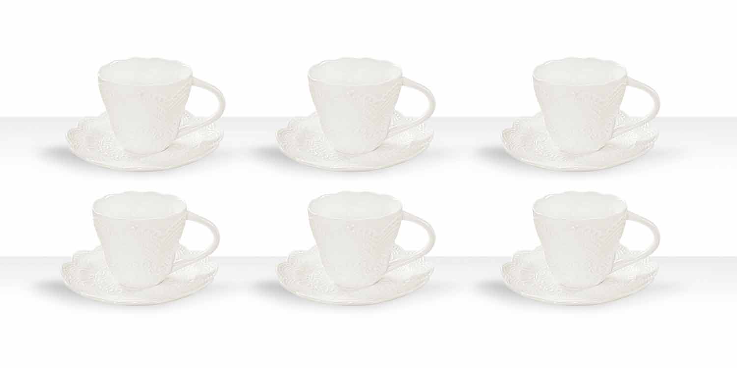 6 căni de ceai cu farfurie în porțelan alb cu design rafinat în stil baroc.