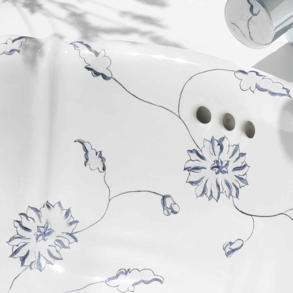 Chiuvetă încorporată fabricată în Italia, în porțelan alb subțire, cu decorațiuni interioare de flori albastre lucrate manual cu tehnica de perie.