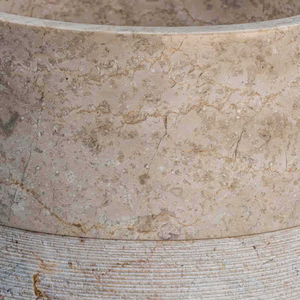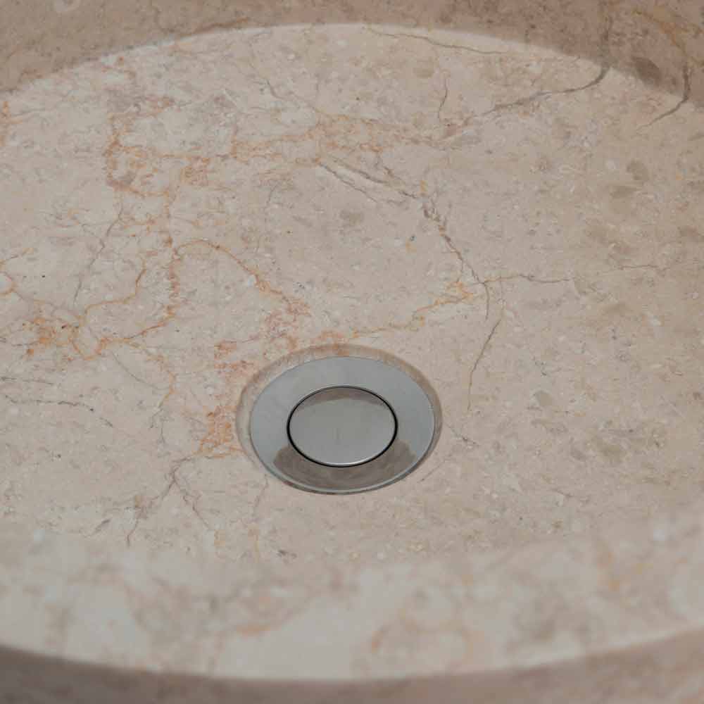 Chiuvetă de marmură de sine stătătoare în nuanțe de fildeș până la crem și variații calde. Compus în două părți, primul „bazinul” este din marmură lustruită atât la exterior, cât și la interior. A doua parte este „baza” realizată prin decorarea marmurei brute cu efect de întoarcere. Tipul de prelucrare folosit pentru baza poate crea fisuri sau fisuri in marmura care NU COMPROMINA in niciun fel integritatea sau siguranta chiuvetei. Astfel de situații nu sunt considerate defecte ale produsului.