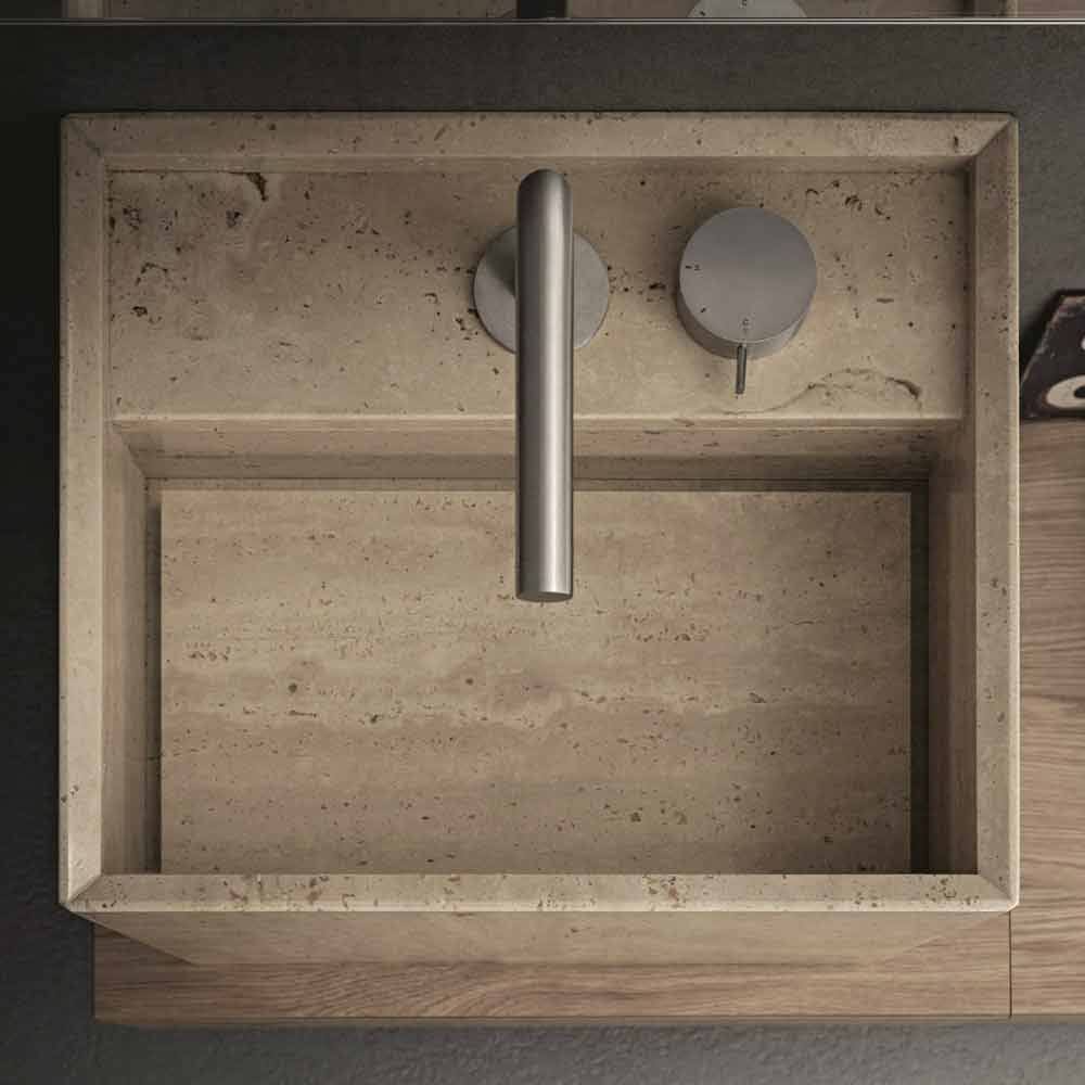 Lavoar de piatră pe blat, finisat în travertin acoperit cu rășină, cu orificiu pentru robinet, fără orificiu de preaplin, excluzând deșeurile.