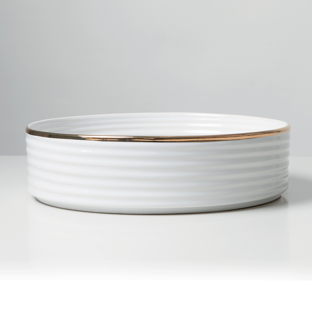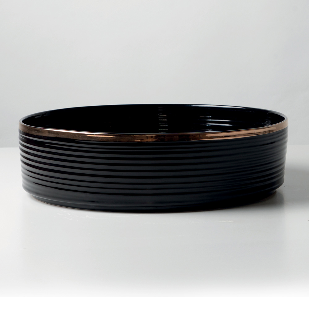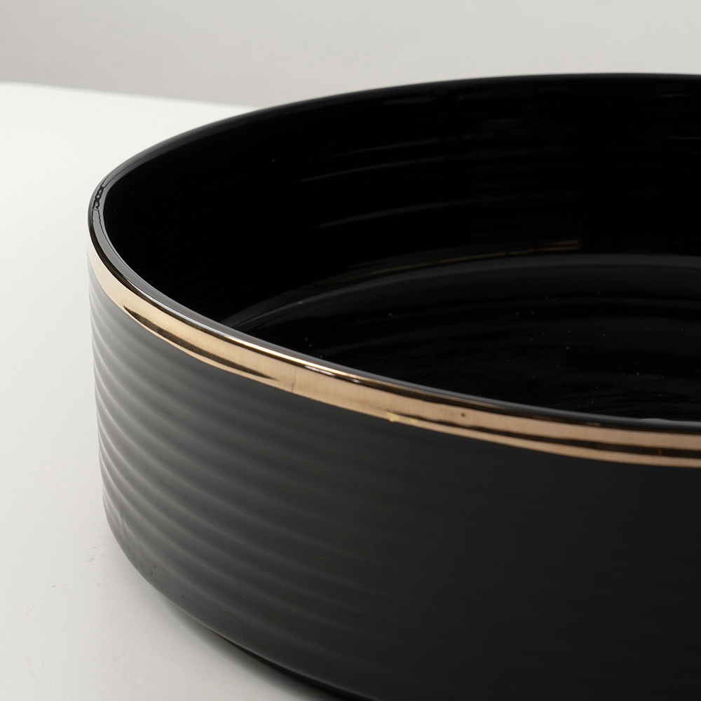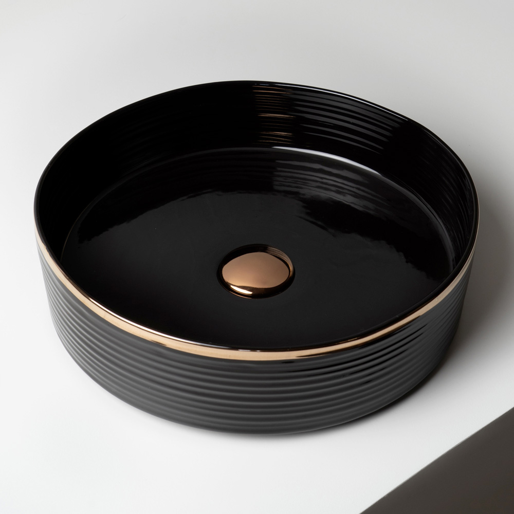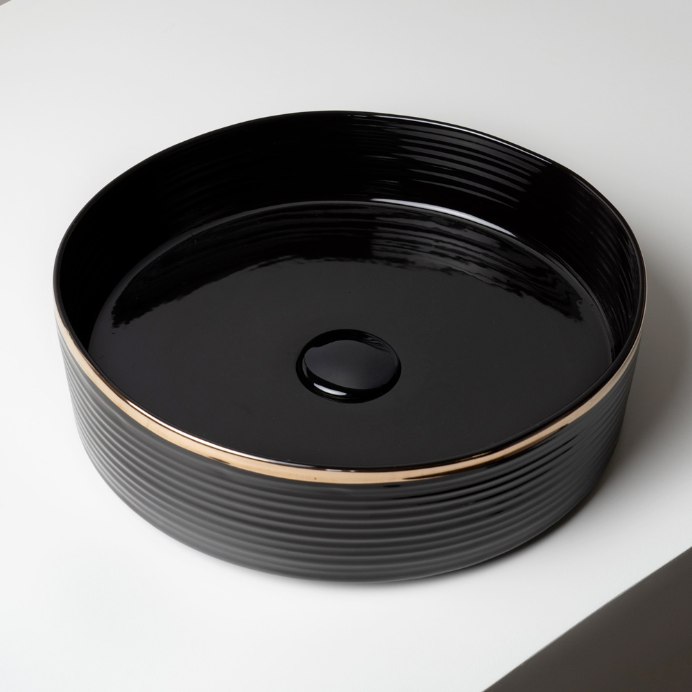 Această versiune prezintă o bordură subțire, finisată manual, cu efect metalic, de-a lungul marginii superioare a chiuvetei. Acest detaliu rafinat conferă eleganță și personalitate, transformând această chiuvetă într-o adevărată bijuterie în baie.