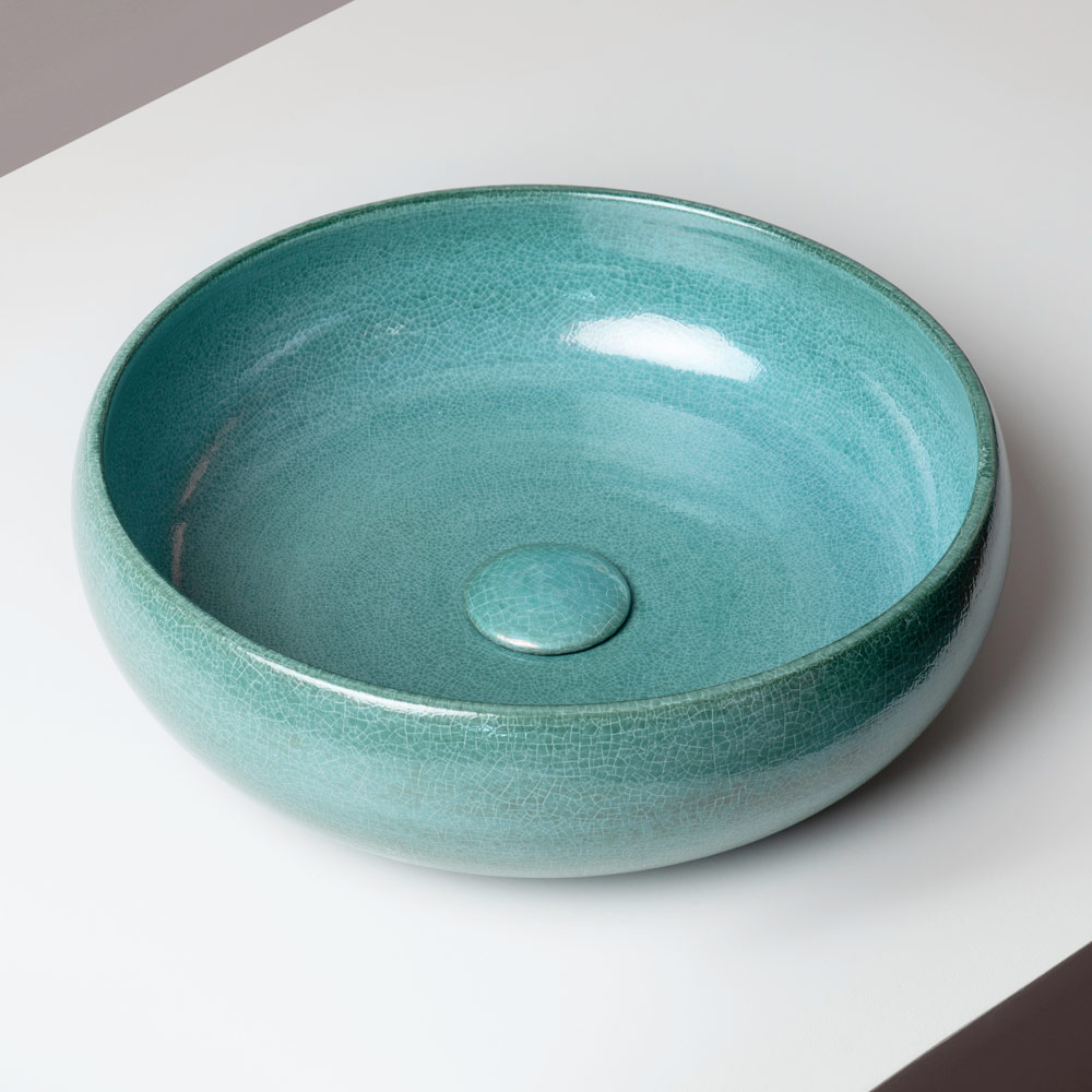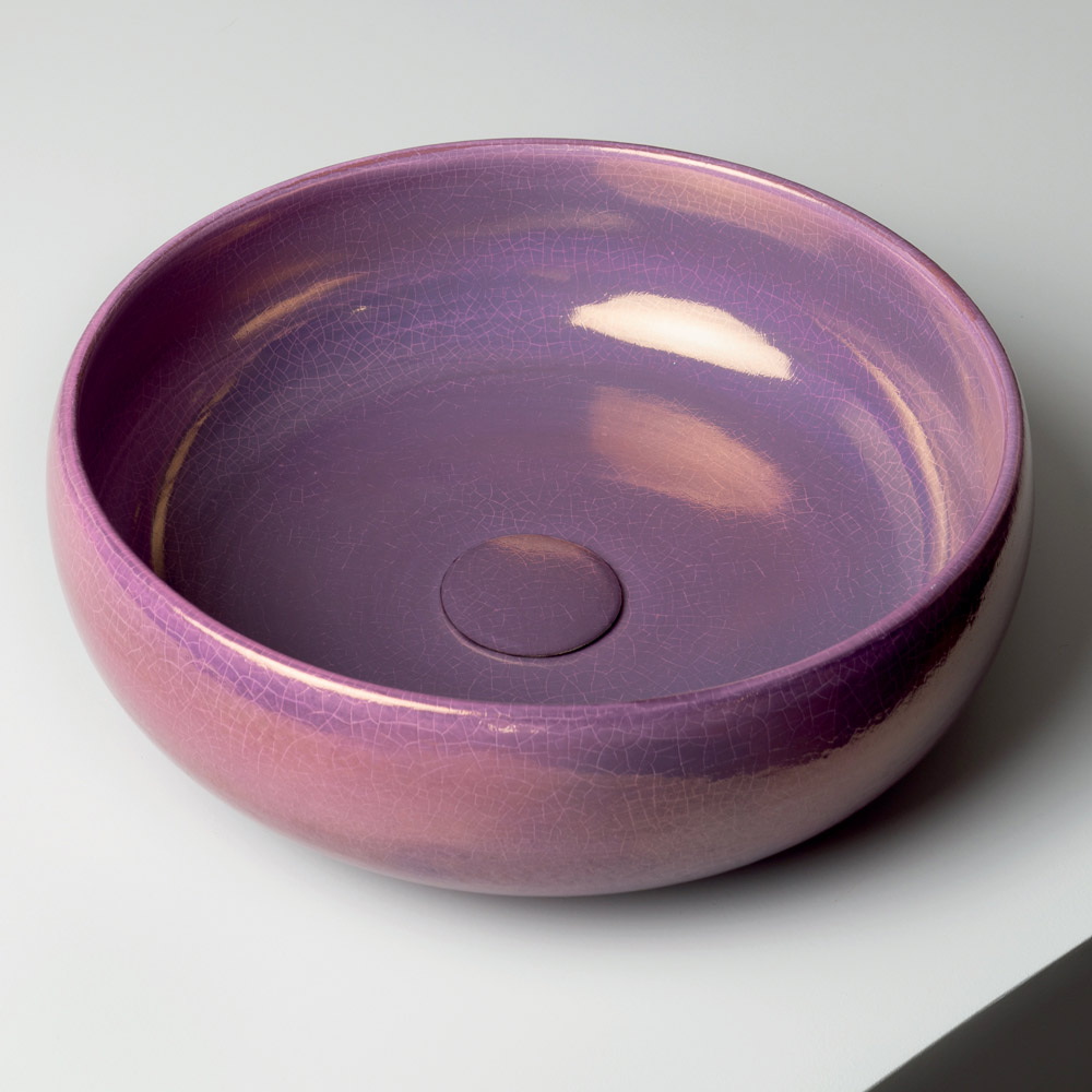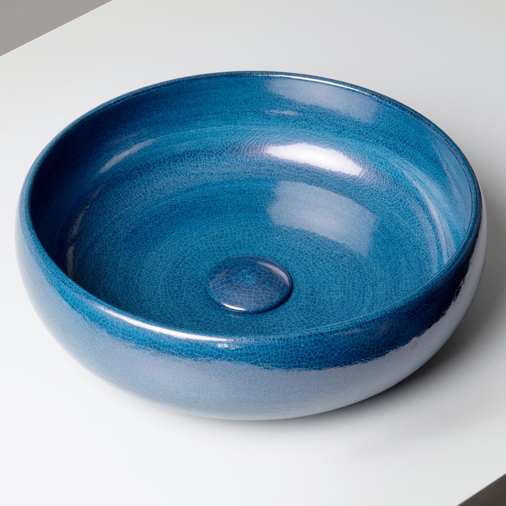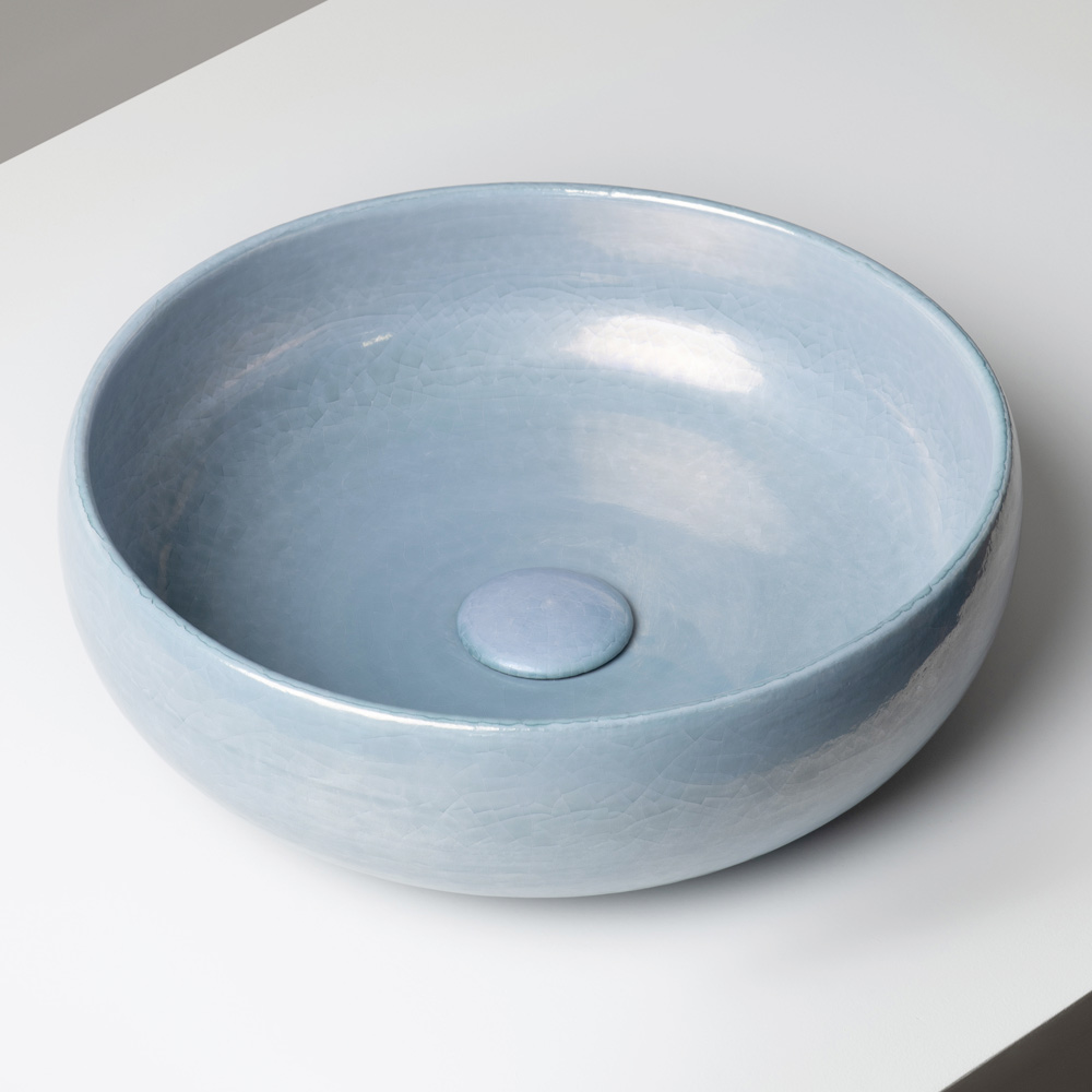 Această chiuvetă de blat din lut Raku este strunjită manual și finisată cu o glazură metalică craquelată , emanând energie vizuală și o personalitate puternică. Un accesoriu de mobilier conceput pentru cei care caută o baie cu caracter, originalitate și aspect contemporan.