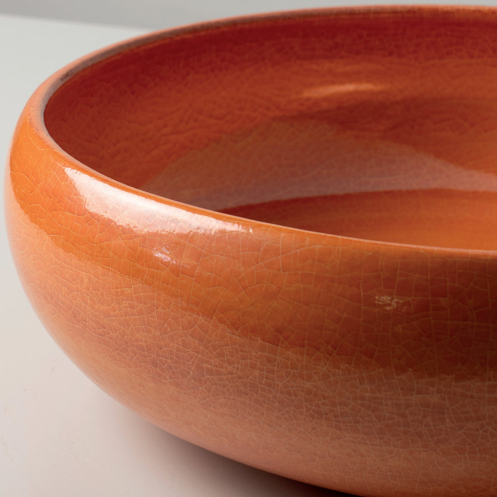 Forma esențială, primordială, este echilibrată de proporții armonioase, în timp ce suprafața glazurată creează reflexii vibrante, neregulate, care fac fiecare chiuvetă unică. Craquelura caracteristică Raku accentuează aspectul texturat, artizanal al produsului, transformându-l într-un element cu adevărat decorativ.