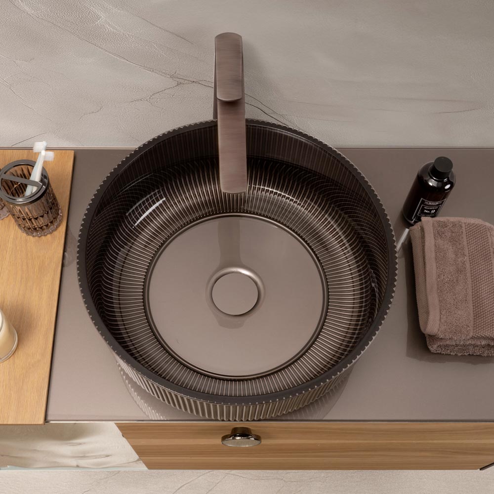 Disponibilă în versiuni sofisticate de culori , chiuveta se adaptează atât ambienturilor clasice, cât și celor contemporane, conferind întotdeauna un caracter exclusivist și rafinat. Nuanțele, combinate cu strălucirea naturală a sticlei, conferă profunzime și mișcare, transformând chiuveta într-o adevărată operă de artă decorativă.