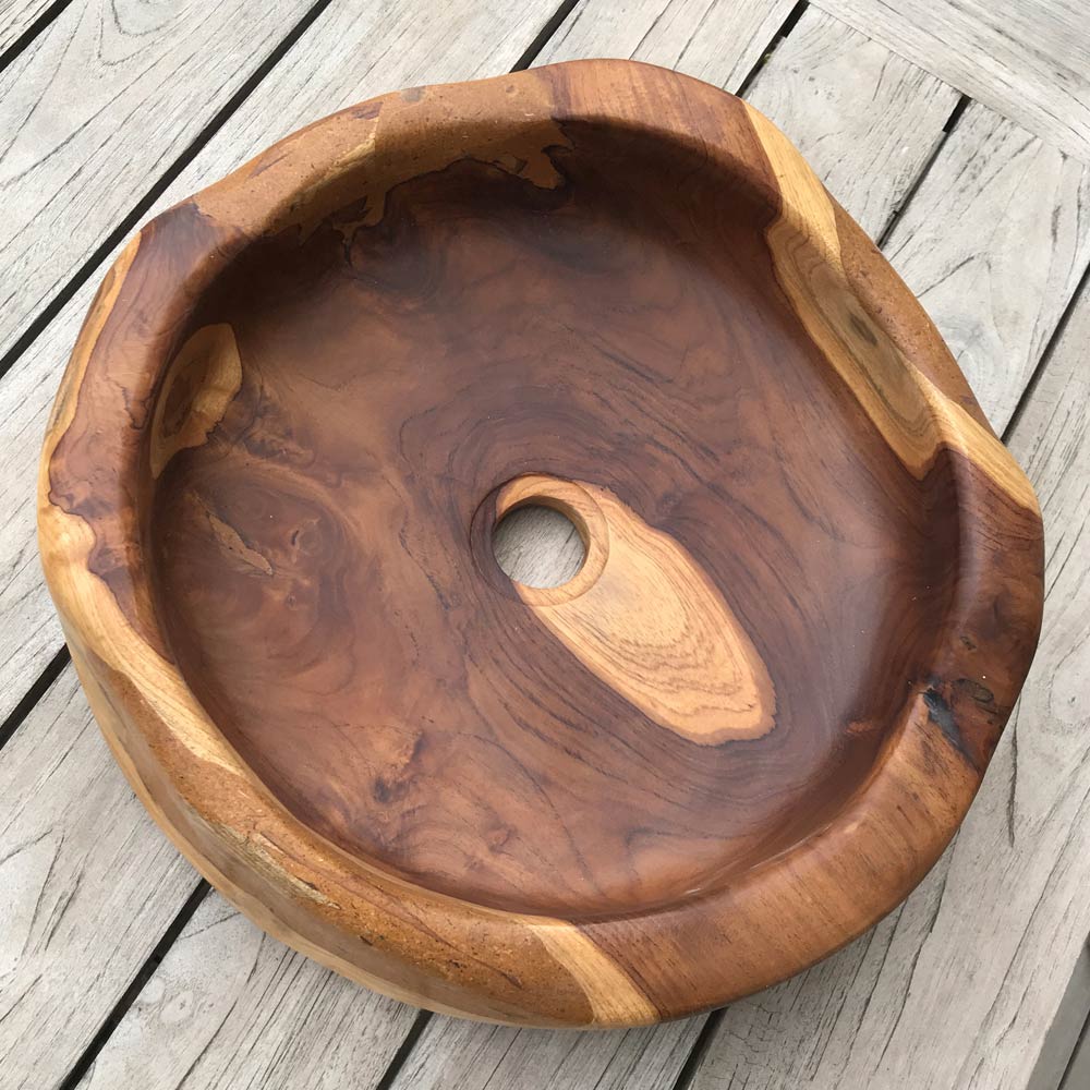 Teak natural si lustruit intr-o forma esentiala si practica. Lemnul netratat redă mirosurile și culorile pădurilor tropicale. Lavoar pe blat din tec natural neted și netratat.