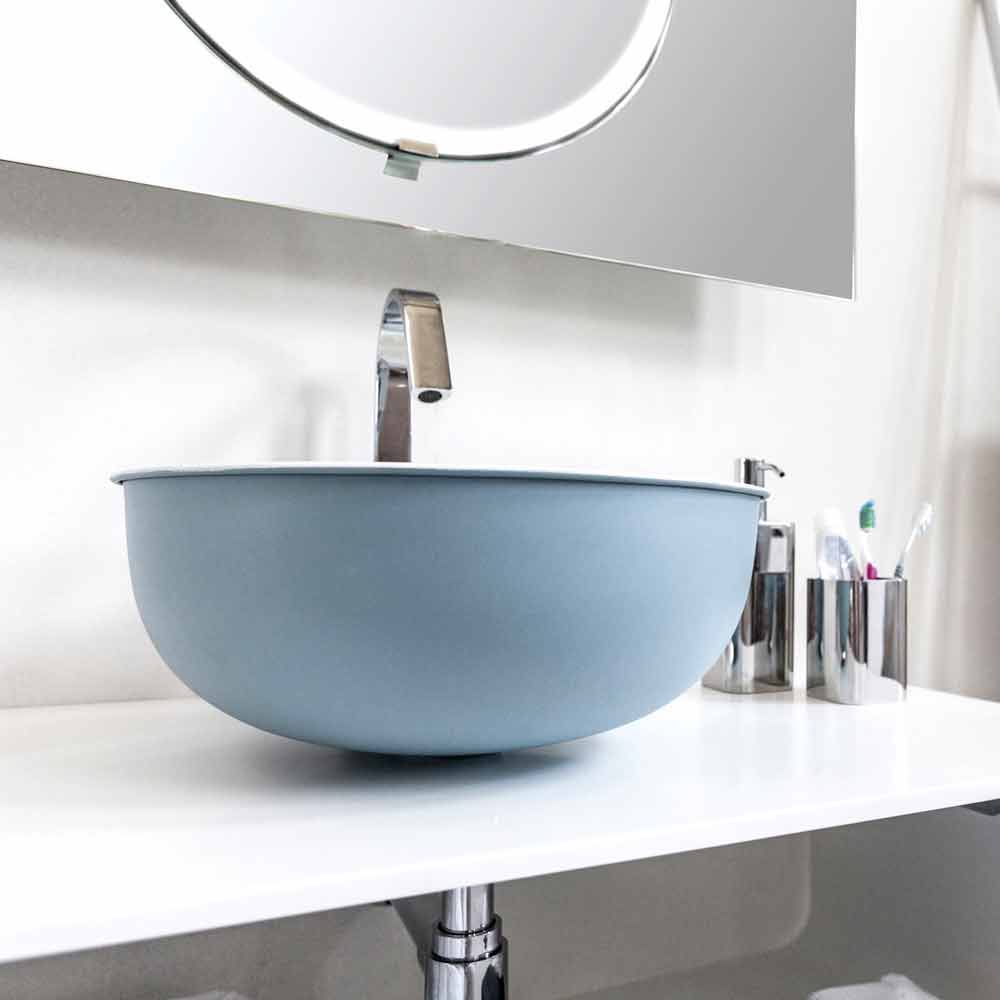 Lavoar blat din metal cu vas. Alb lucios smălțuit interior, colorat exterior mat cu efect aspru. Marginea superioară „încrețită” oferă chiuvetei mai multă rezistență și ușurință de curățare.