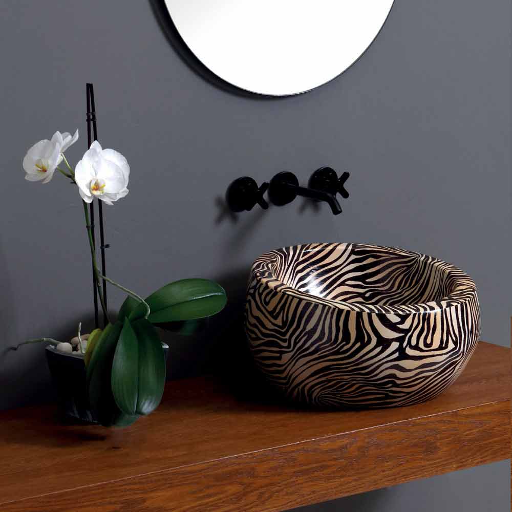 Elisa este o chiuvetă de blat ceramică cu finisaj portocaliu zebră, cu linii ușoare și decisive.