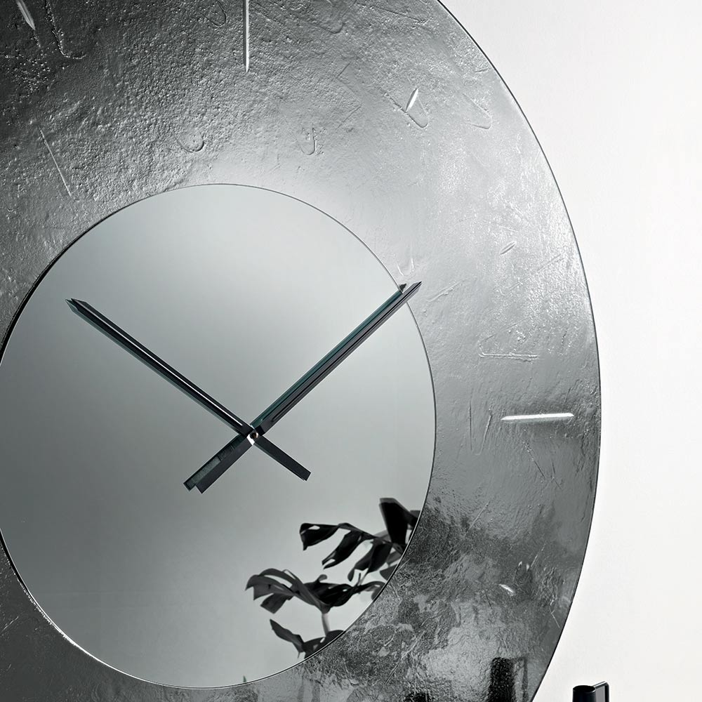 Ceasul are o formă rotundă atrăgătoare din punct de vedere vizual , înfrumusețată cu o ramă din sticlă topită ciocănită, argintie pe spate , care creează un joc rafinat de reflexii și profunzime. În centru, o inserție oglindită ton pe ton găzduiește acele, conferind echilibru și luminozitate compoziției.