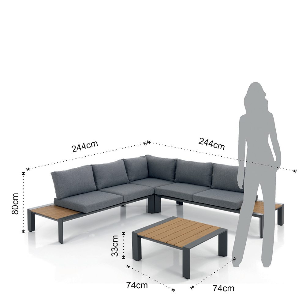 Această canapea de colț și masă de grădină reprezintă chintesența relaxării elegante și a stilului contemporan. Cu structura și liniile sale curate, canapeaua oferă un contrast șic și modern cu lemnul cald al scaunelor și al suprafeței mesei, creând un mediu primitor, care este atât primitor, cât și plăcut din punct de vedere estetic .