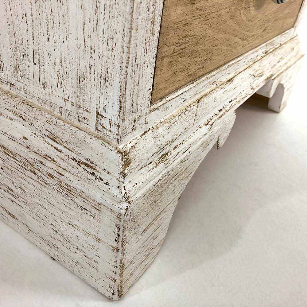Comoda din lemn masiv de abet și realizată manual în Italia, cu finisaj alb îmbătrânit. Cele 4 sertare au o structură de placaj de plop de 10 mm pentru a păstra mai mult spațiu în interior, în timp ce panoul frontal este din lemn de 18 mm și este completat de butoane speciale din ceramică pictate manual. Minunatele culori care îmbogățesc sertarele sunt obținute datorită utilizării terenurilor naturale agregate cu cleiuri de origine animală, materiale alese ca alternativă la vopselele industriale obișnuite. Această alegere de construcție înseamnă că fiecare articol poate reduce la minimum prezența formaldehidei, o substanță dăunătoare clasificată ca cancerigenă. Comoda este completată în cele din urmă cu un finisaj transparent care o face hidrofugă și fixează culorile pentru a le face neschimbabile în timp.