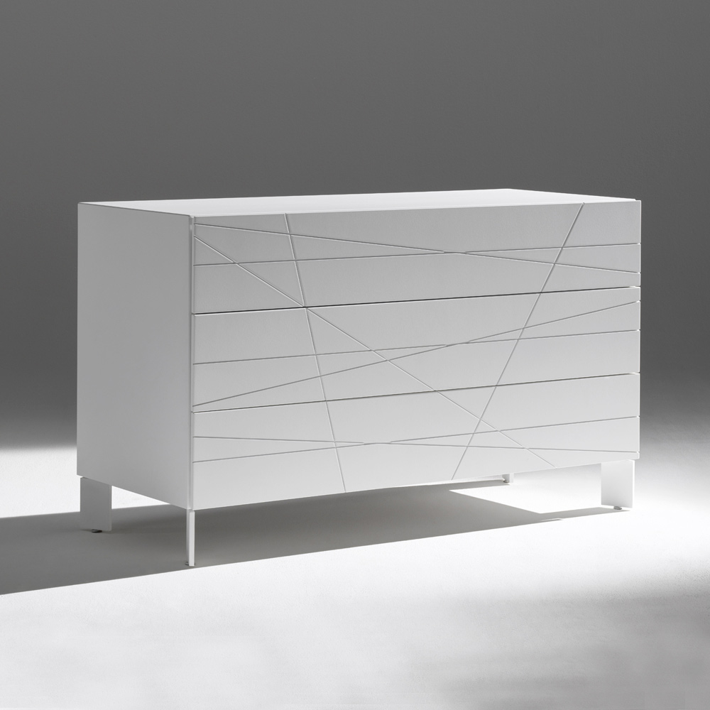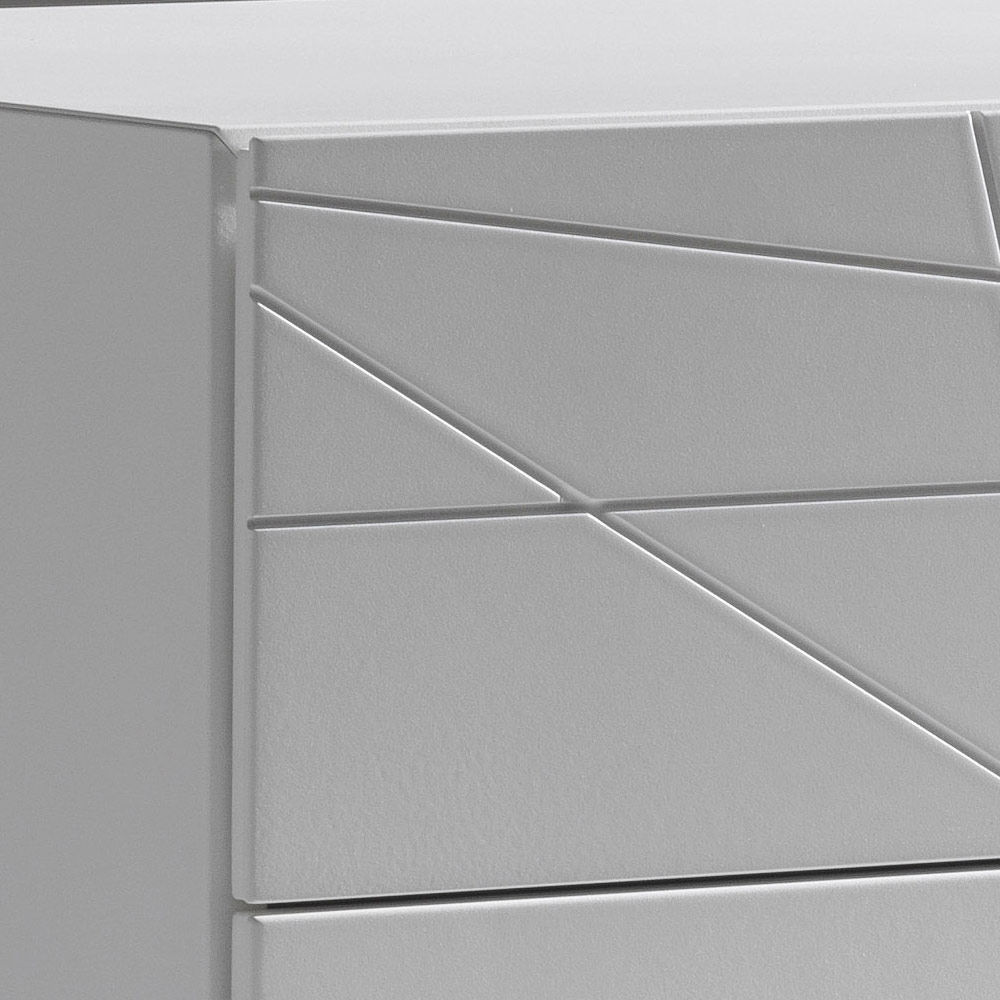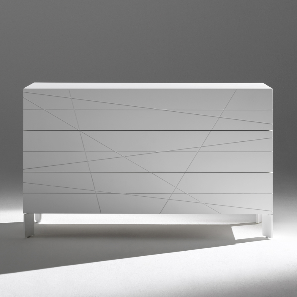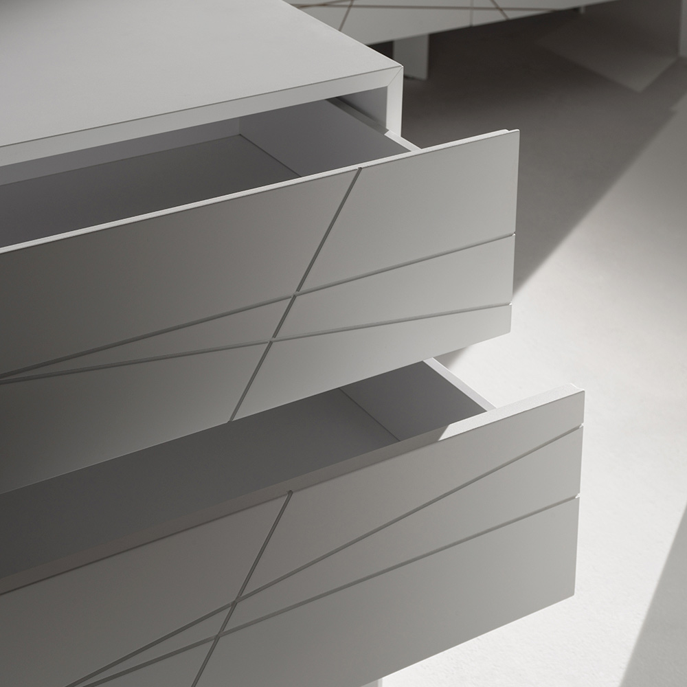 O comodă cu un design contemporan și riguros, cu o identitate grafică puternică și linii curate. Inciziile geometrice de pe fronturi creează un joc elegant de linii care interacționează cu lumina, transformând piesa într-o adevărată piesă de rezistență în dormitor.
