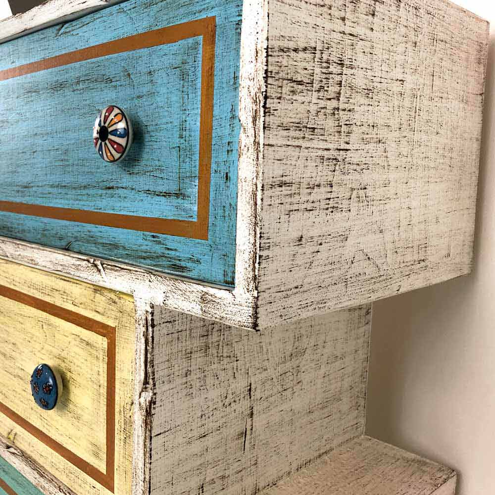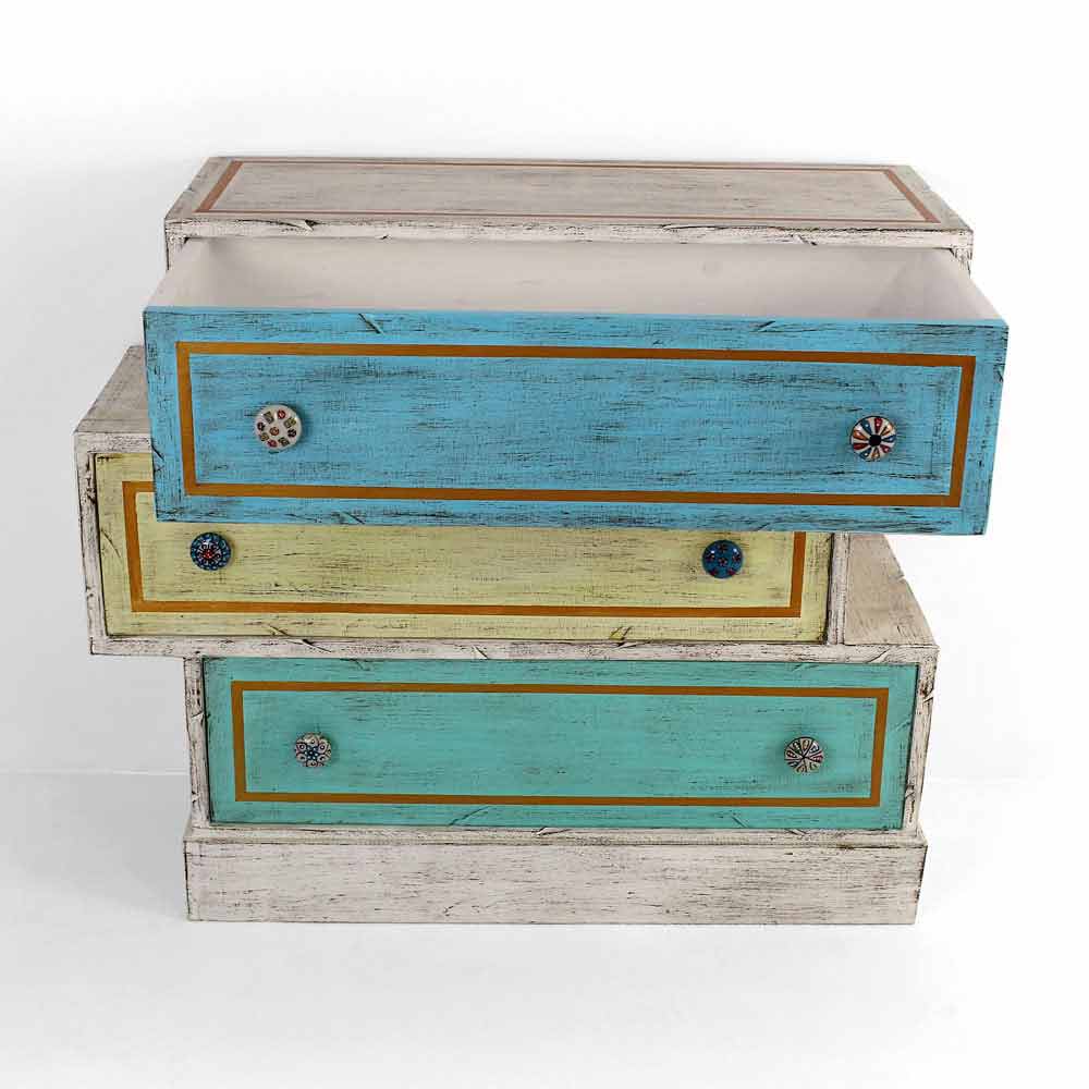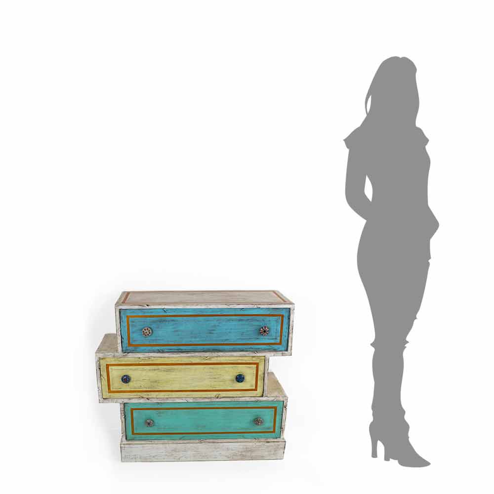 Comodă artizanală cu structură realizată în Italia din lemn masiv de brad finisat alb cu 3 sertare eșalonate din placaj de plop cu față din lemn pictată manual și îmbogățită cu detalii elegante în butoane din aur antic și ceramice. Culorile minunate care completează și fac designul acestui produs unic sunt obținute prin utilizarea terenurilor naturale agregate cu cleiuri de origine animală, materiale alese ca alternativă la vopselele industriale obișnuite. Datorită acestei alegeri a producătorului, fiecare articol încearcă să reducă la minimum prezența formaldehidei, o substanță dăunătoare clasificată ca cancerigenă. Comoda este completată în cele din urmă cu un finisaj transparent care o face hidrofugă și fixează culorile pentru a le face neschimbabile în timp.