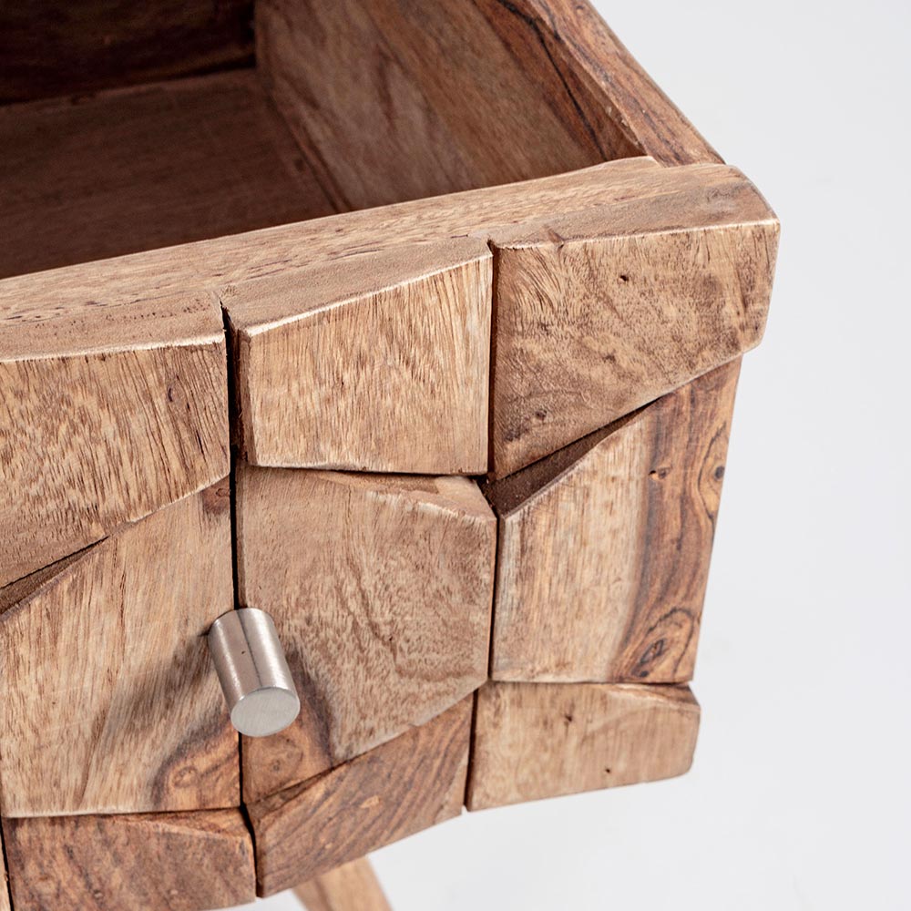 Această comodă de design pentru living are o structură din lemn de sheesham , cu spatele și fundul sertarelor din placaj.