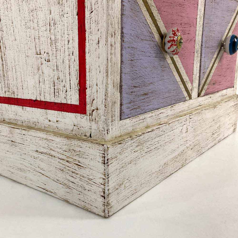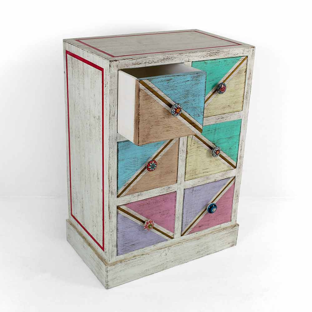 Comodă din lemn artizanală, cu sertare vopsite cu model geometric, obiect fin Made in Italy.