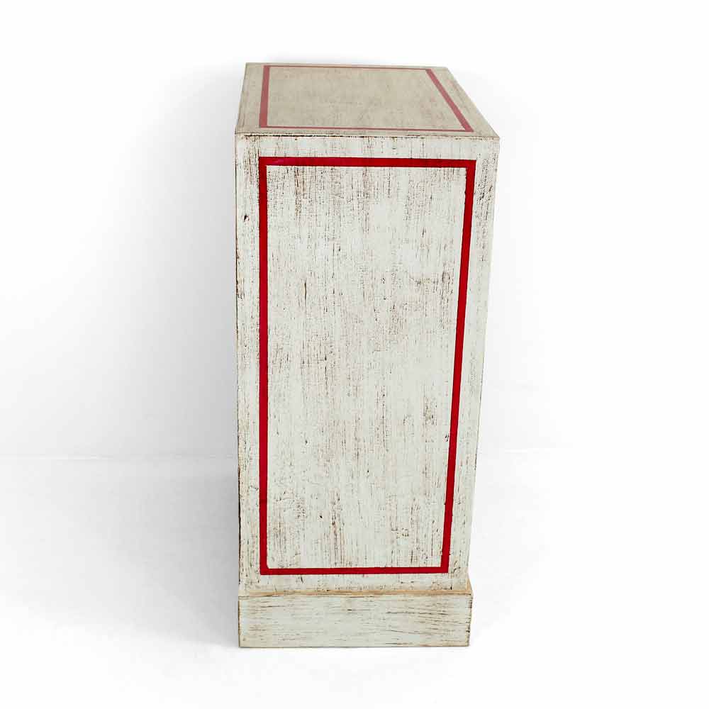 Comodă realizată manual în Italia cu structură din lemn masiv de abet și, finisaj alb îmbătrânit și 6 sertare din placaj de plop cu panou frontal din lemn vopsit în diagonală și detalii în aur și roșu antic Produsul este finisat cu un finisaj transparent care îl face hidrofug și fixează culorile pentru a le face neschimbabile în timp.