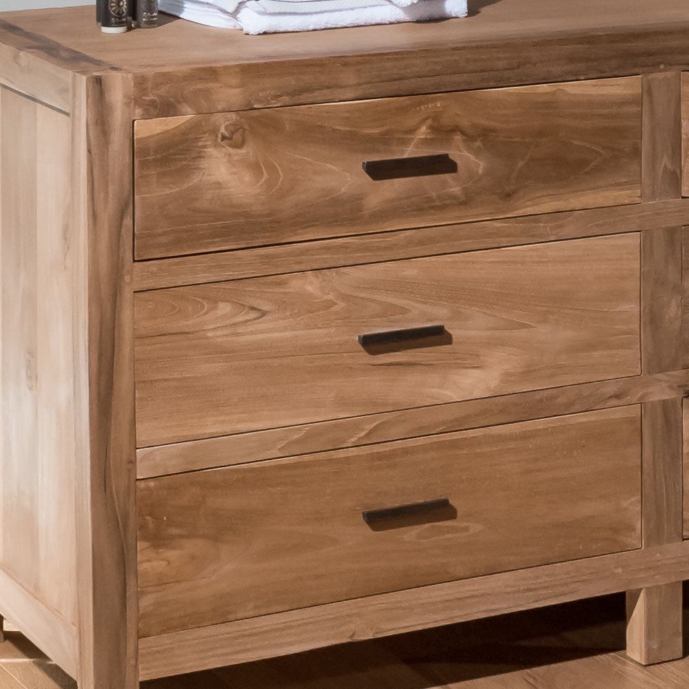 Această comodă din lemn masiv de tec este o piesă robustă și elegantă, ideală pentru a decora dormitorul sau livingul cu stil. Măiestria și textura naturală a lemnului îi conferă un aspect cald și autentic, capabil să îmbunătățească orice spațiu.