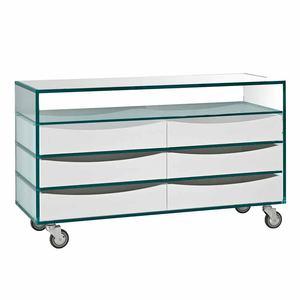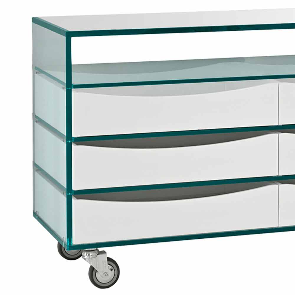 Comodă în stil modern pe roți din sticlă extraclară cu șase sertare din lemn alb, realizate în Italia de mână.