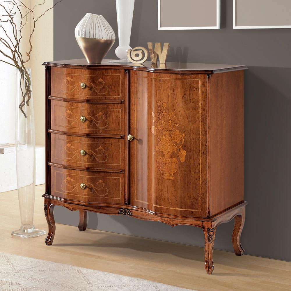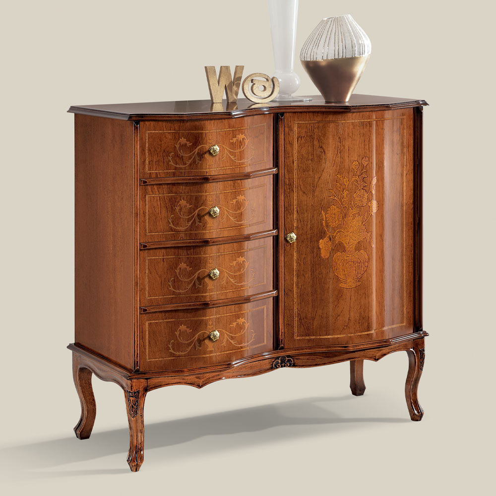 Comoda cu o usa si patru sertare intr -un stil clasic si elegant . Realizata din lemn pretios de nuc lustruit cu incrustatii aurii care il fac o completare rafinata capabila sa infrumuseteze mediul in care este amplasat. Complet realizat în Italia și lucrat manual de meșteri pricepuți , finisat cu înțelepciune și gust pentru eleganță. Producția este realizată folosind materiale fine , iar lucrul este realizat manual cu cea mai mare grijă și profesionalism care distinge produsele Made in Italy .