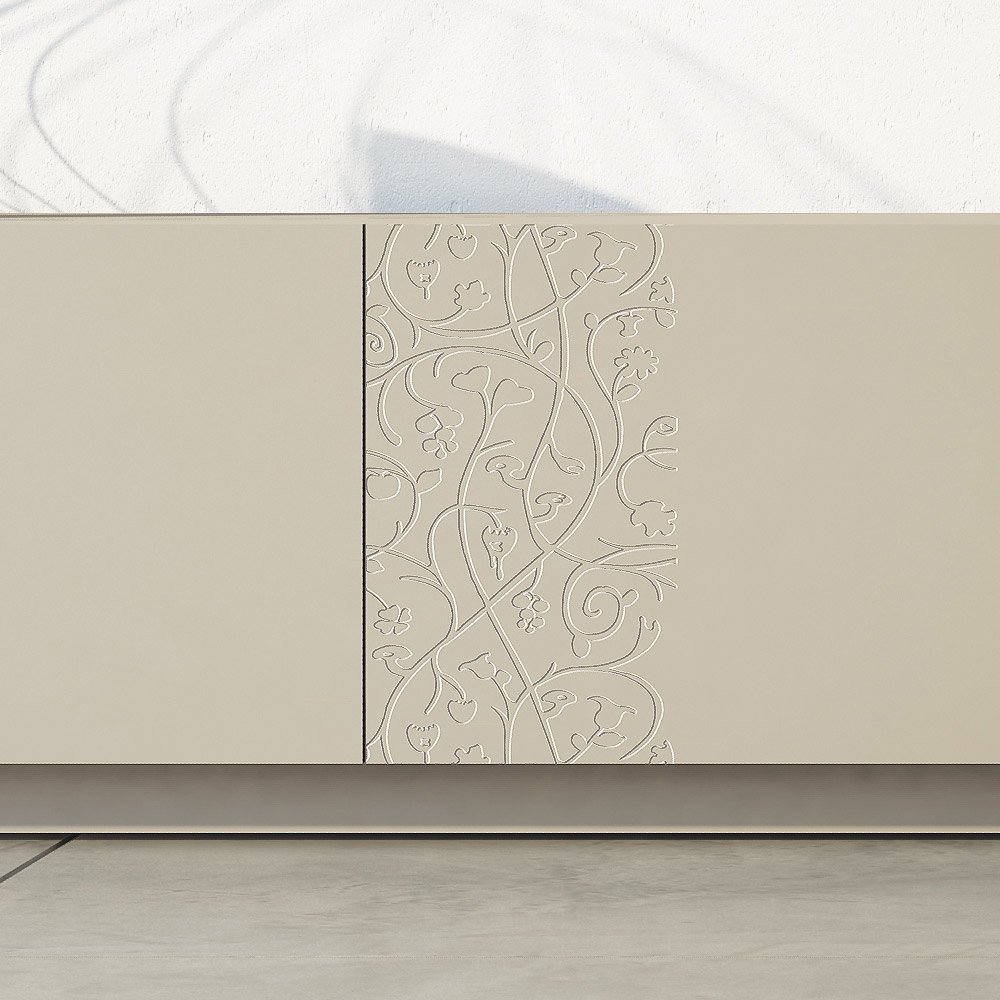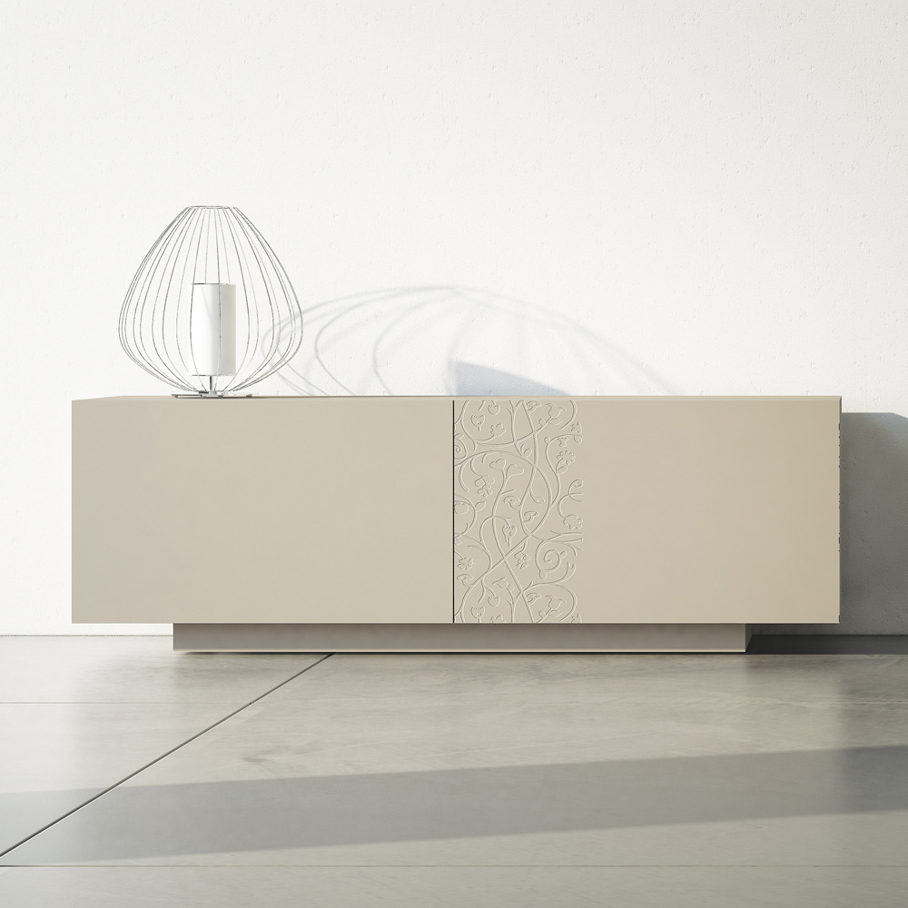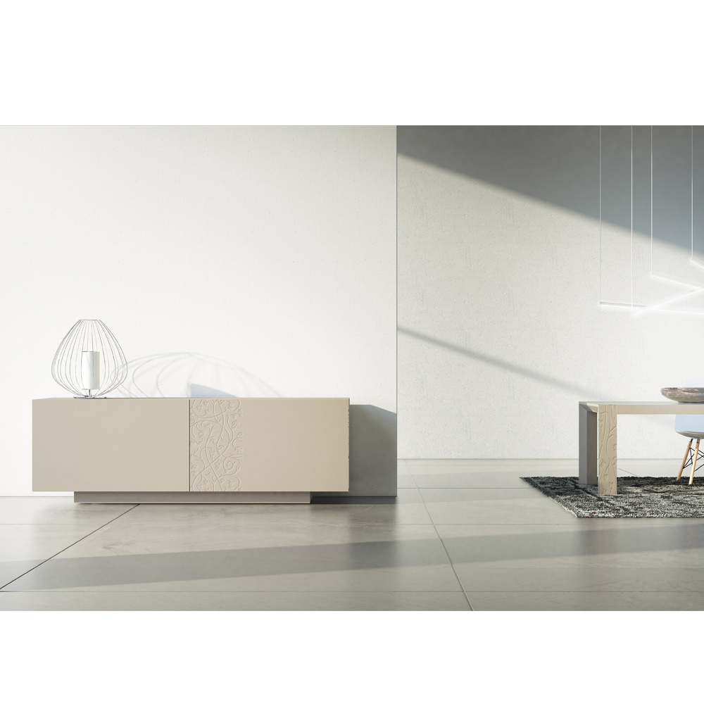 Bufet de living cu structura MDF lacuit mat gri alpaca compusa din 2 usi glisante coplanare care garanteaza o mare functionalitate si practicitate si din soclul lacuit care ofera multa stabilitate. Acest produs este plin de gust și design datorită finisajelor sale elegante și rafinate și decorului parțial în basorelief al ușilor, ceea ce îl face unic în felul său. Diferitele materiale folosite pentru constructie ofera o mare calitate si rezistenta in timp, oferind produsului acea nota unica si de neuitat.