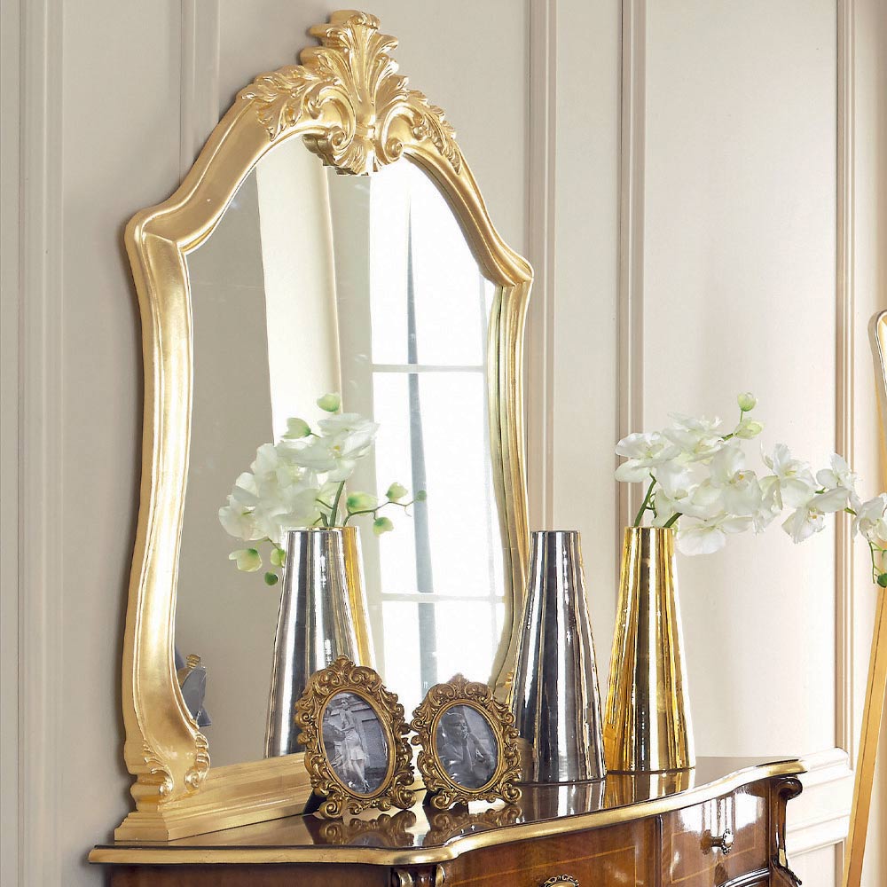 nuc Bassano si auriu antic cu incrustatii elegante si 5 sertare practice. Comoda este completata si cu o oglinda in forma din lemn acoperita cu foita de aur.