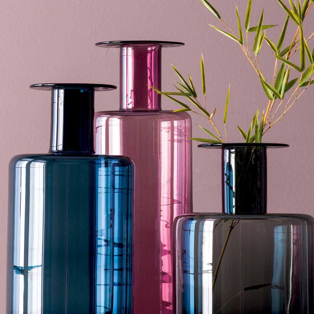 Compoziție a 3 vaze moderne din sticlă colorată.
