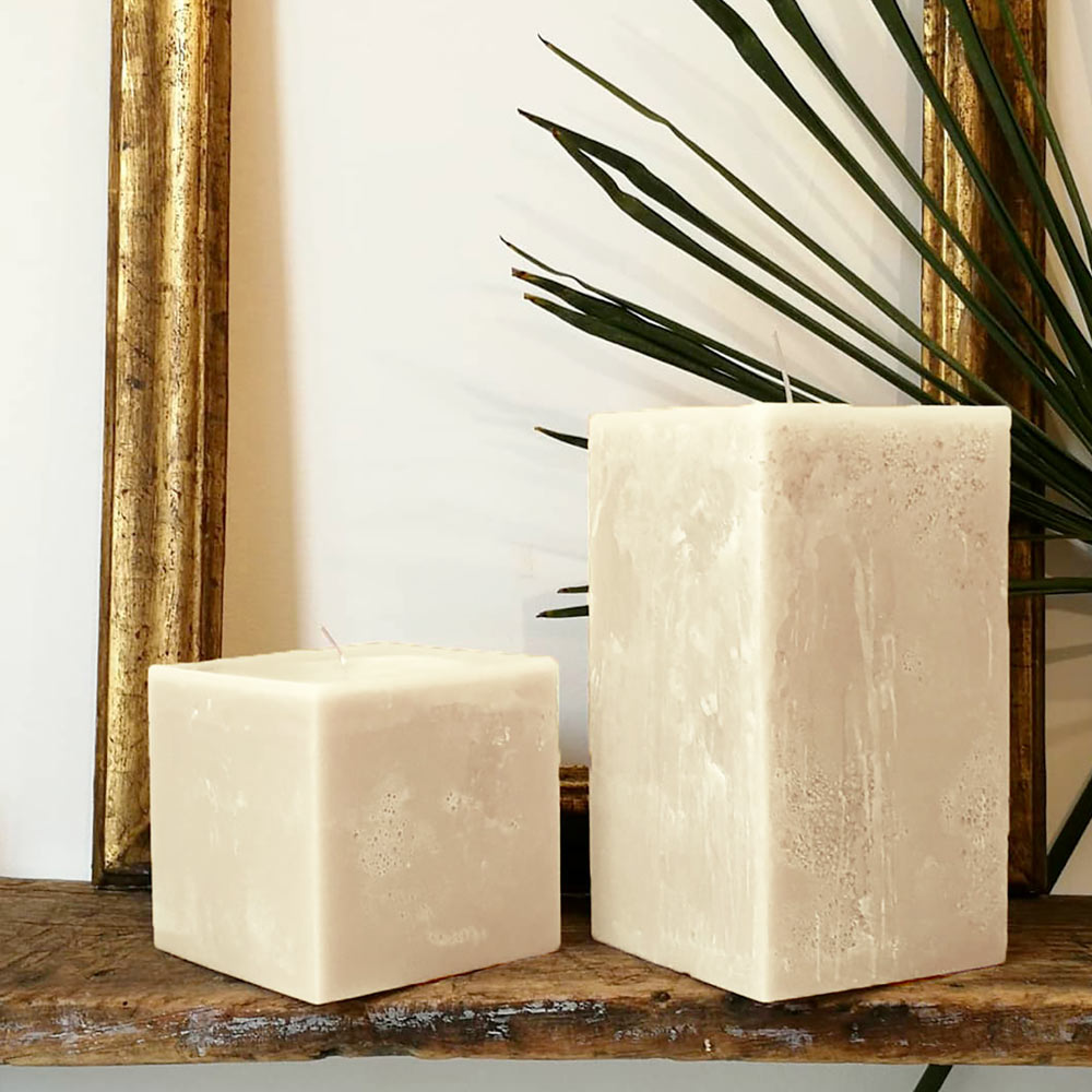 Componență de 3 lumânări pătrate de diferite dimensiuni și disponibile în diferite culori, confecționate din ceară Made in Italy.