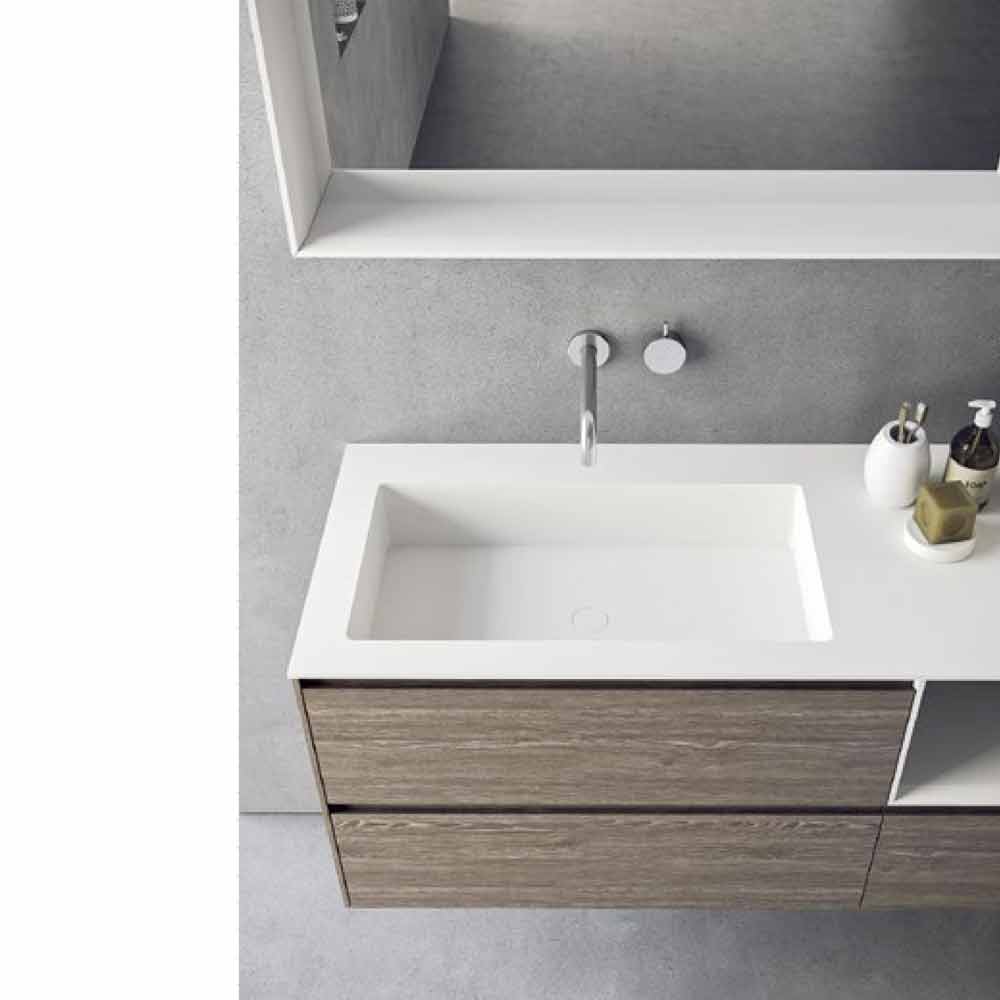Compoziție minimală pentru baie, design suspendat și curbat cu chiuvetă integrată, fabricată în Italia.