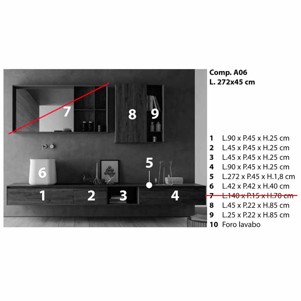 Compoziția mobilierului de baie modern, cu design suspendat și cu membre lungi, cu chiuvetă pe blat, fabricat în Italia.