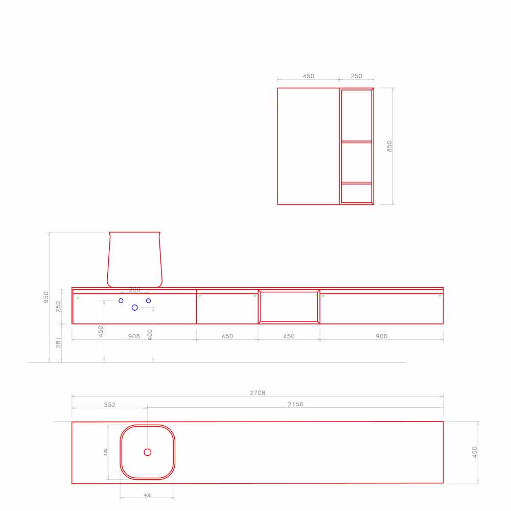 Particularitatea acestei compoziții este dată de silueta lavoarului înalt de blat , care se distinge prin marginea care se deschide spre exterior amintind forma unei lalele, spre deosebire de liniaritatea compartimentelor subiacente, atenuând formele.