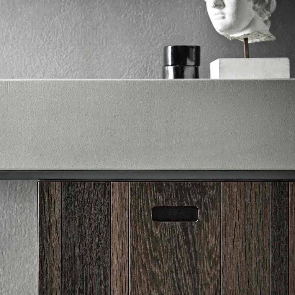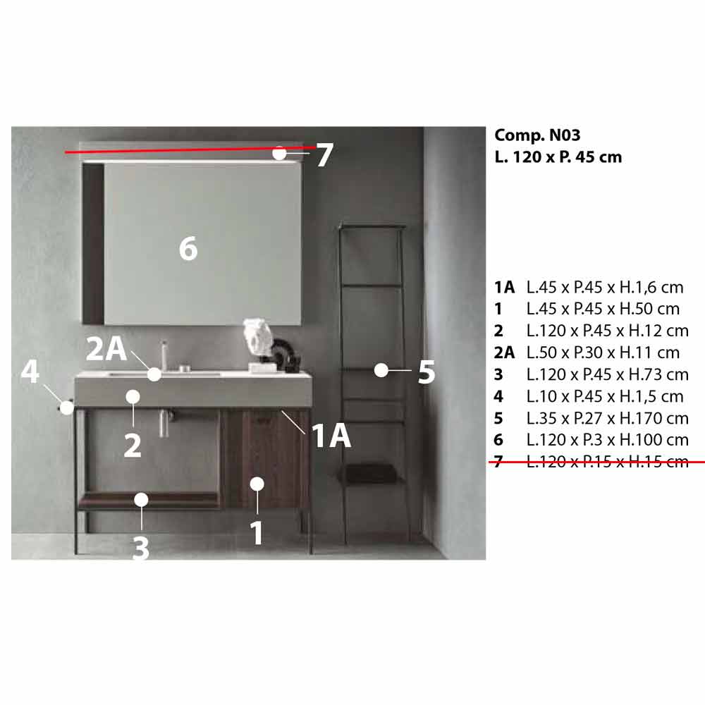 Această compoziție este din stejar tratat termic, lavoar din rășină de ciment gri deschis; cavaler și scară pentru obiecte din lac gri închis mat.