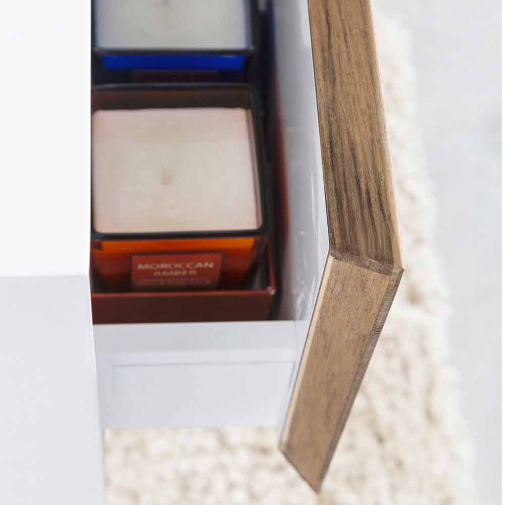 Dulap de baie suspendat din Teak și Hi Macs® Burma Teak și nuanțele sale moi și calde se întâlnesc cu albul eteric al