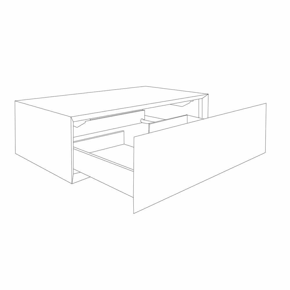piatră acrilică naturală - Hi Macs® cu sertar din Teak masiv, închidere prin împingere/tragere și predispoziție pentru scurgere centrală. Se livrează cu console și șuruburi de fixare pe perete. Orificiul pentru robinet poate fi făcut cu ușurință „la fața locului” cu un burghiu normal.