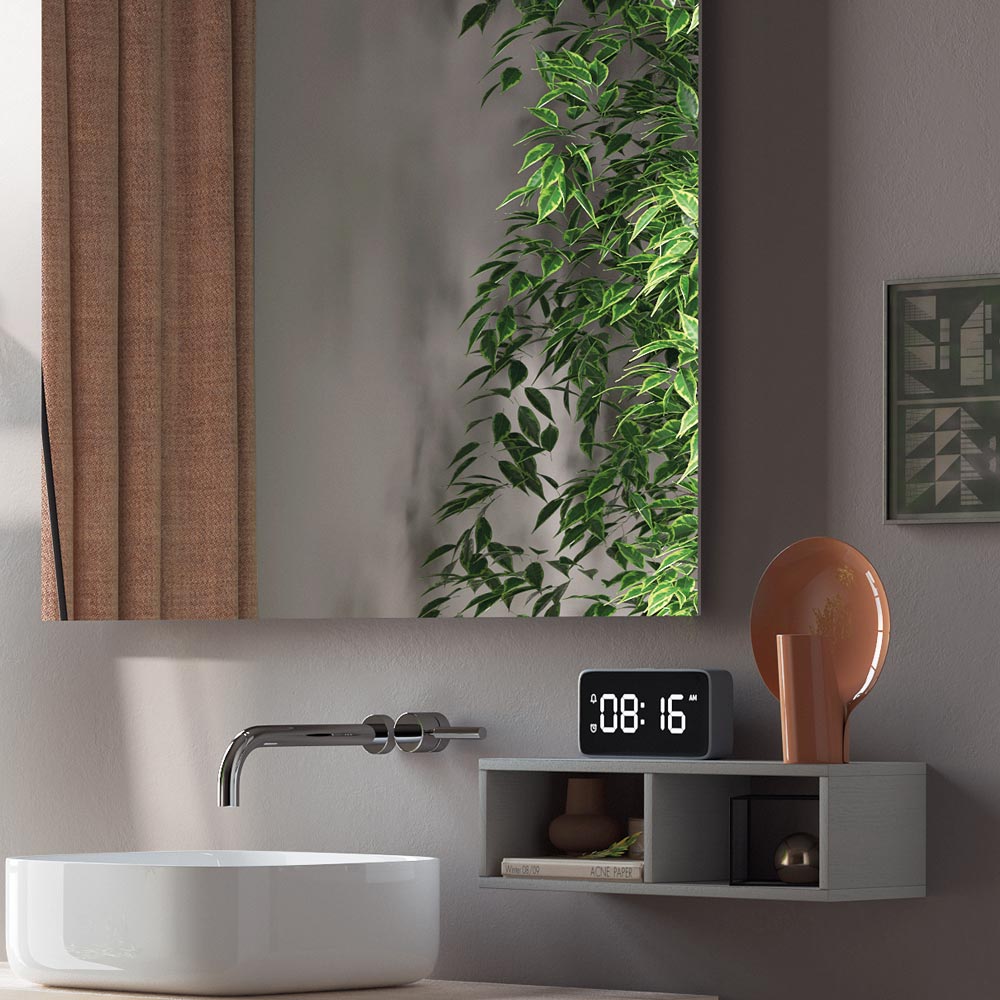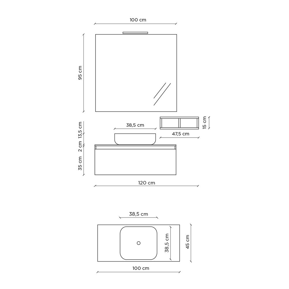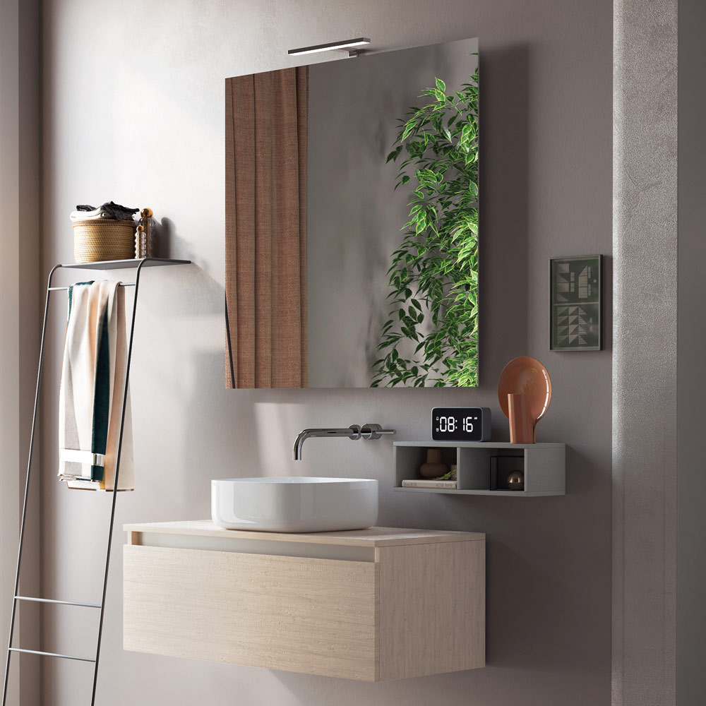 Compozitie baie cu chiuveta din ceramica alb lucios cu marginea subtire, oglinda cu cadru ABS inclusiv lampa , baza suspendata din melaminat rezistent la zgarieturi din stejar natural cu sertar complet extractibil si inchidere moale.