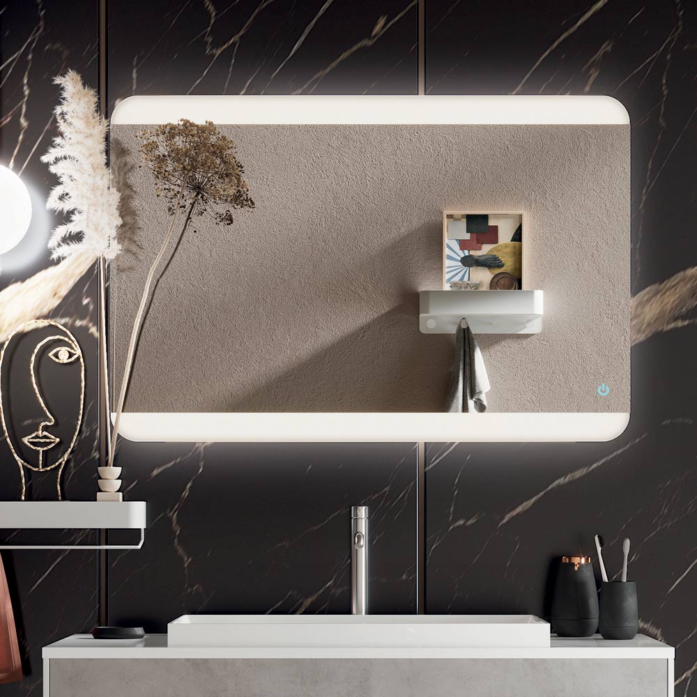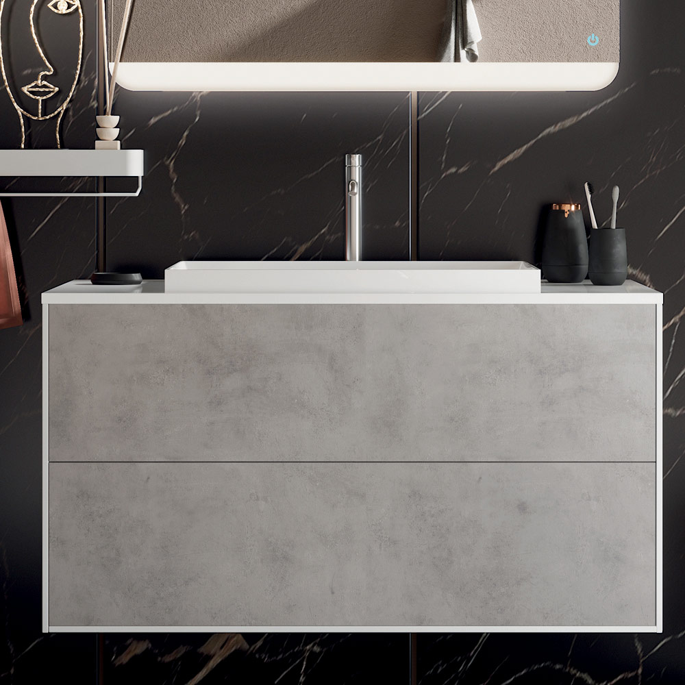 Compoziție de baie completă cu chiuvetă încorporată din rășină , oglindă din sticlă cu LED-uri frontale și perimetrale și bază din melamină rezistentă la zgârieturi, de culoarea cimentului, cu 2 sertare complet extractibile și închidere moale.