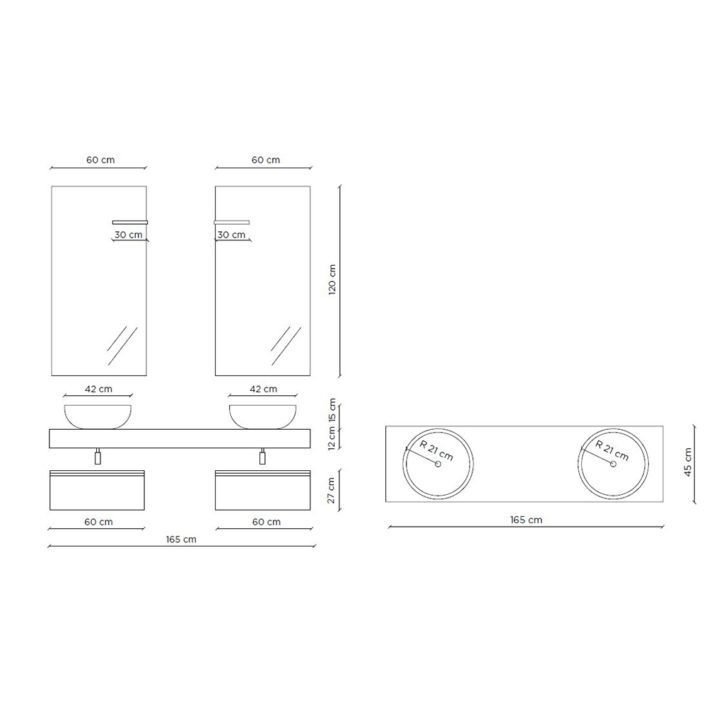 Compozitie baie compusa din: 2 lavoare din rasina alba mata sprijinite pe un blat din stejar de culoarea mierii, 2 baze din melaminat alb lucios rezistent la zgarieturi si 2 oglinzi cu lampa LED.